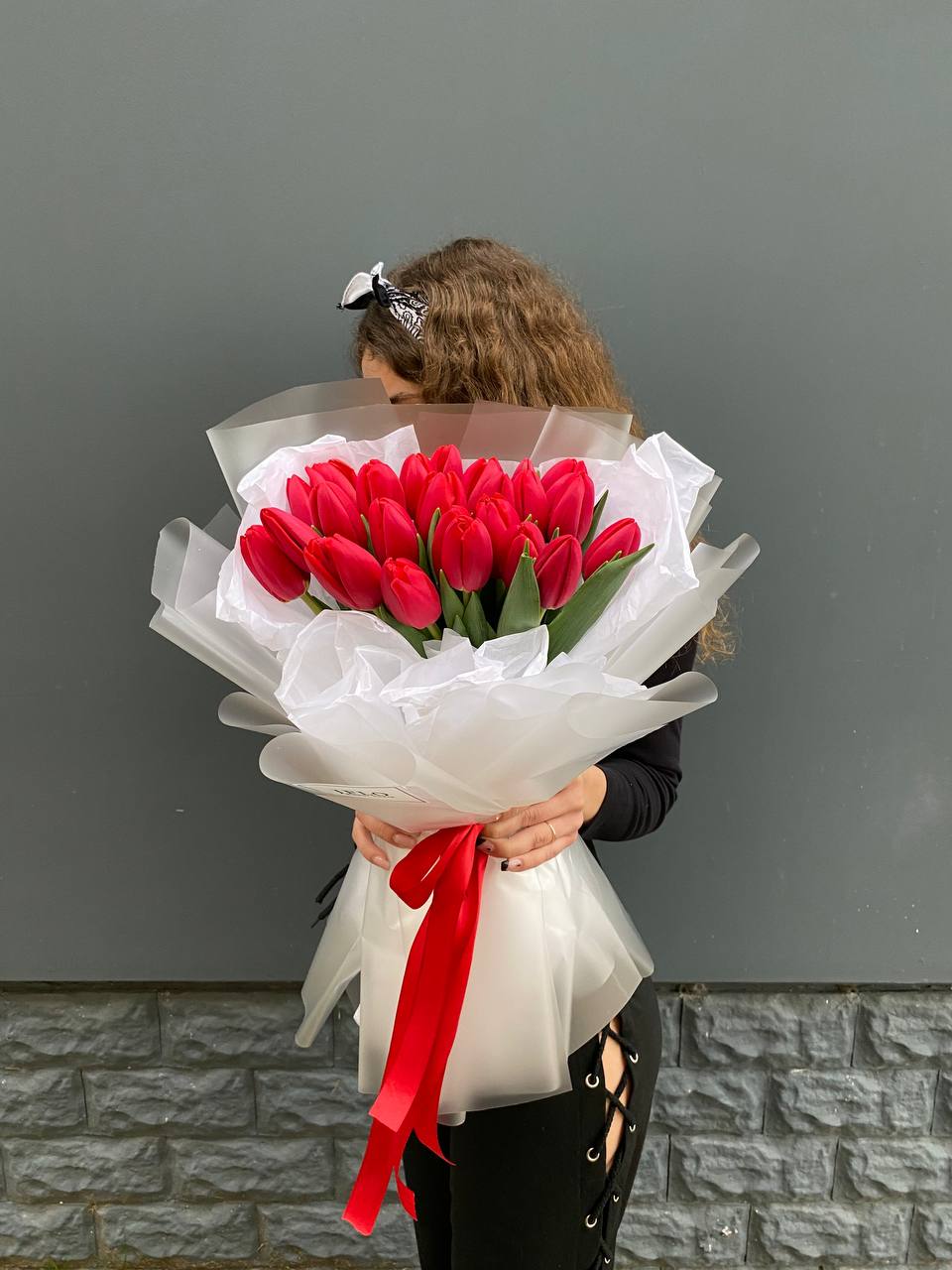 Двадцать пять алых тюльпанов выстроены в насыщенный монохромный букет. Красный цвет звучит уверенно и создаёт яркое впечатление с первого взгляда.