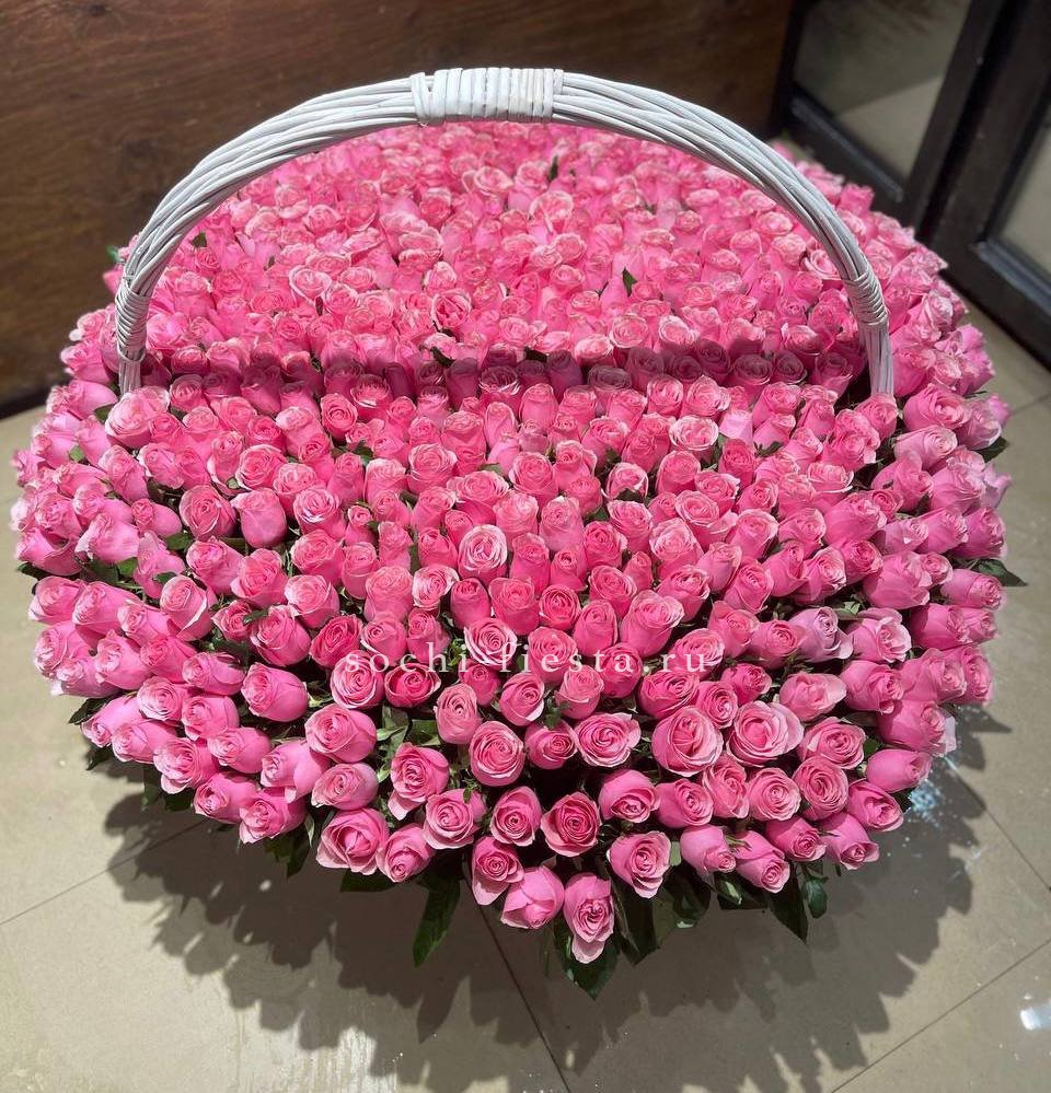 Пятьсот один бутон выстроены плотными рядами в глубокой корзине. Белоснежная композиция создаёт эффект цветочного облака, способного заполнить собой всё пространство вокруг.