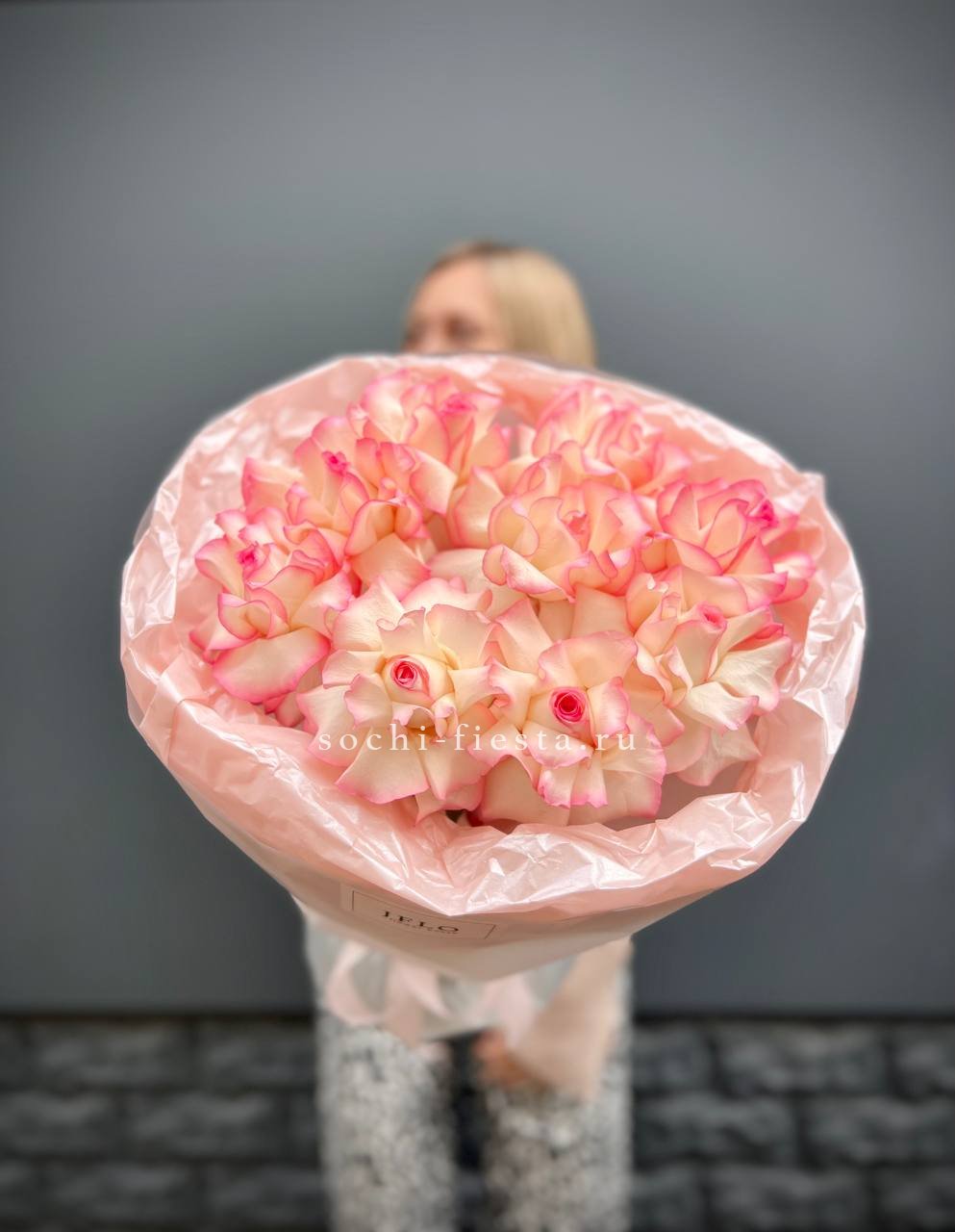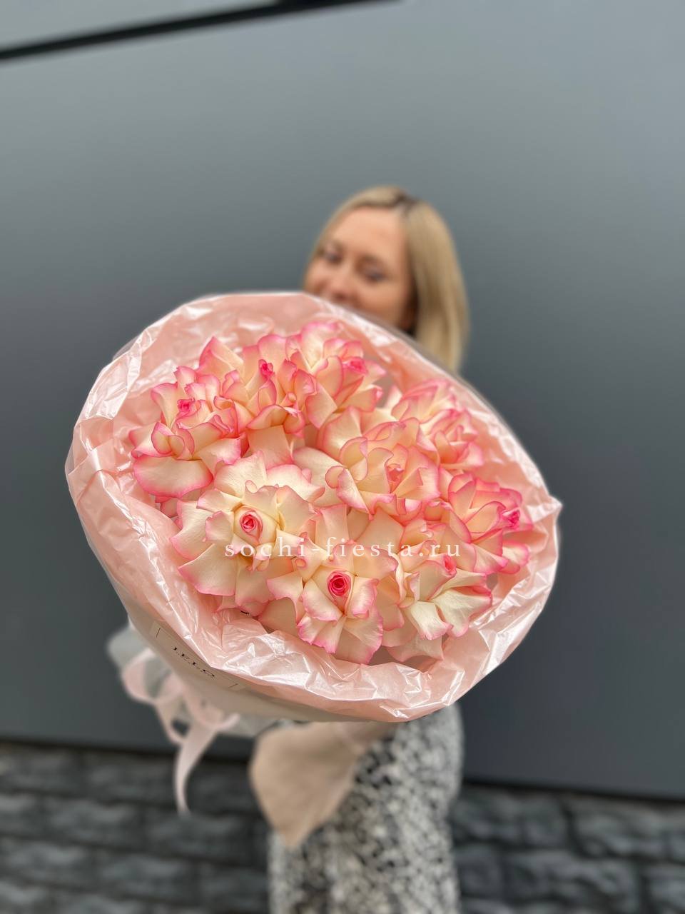 Пятьдесят один бутон в мягкой бело-розовой гамме создает объемную форму с живым ритмом. Микс оттенков добавляет воздушности и естественной динамики композиции.
