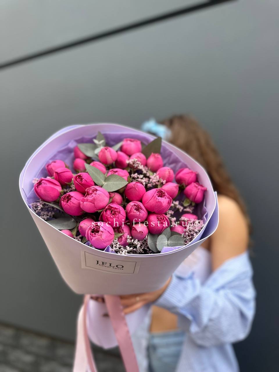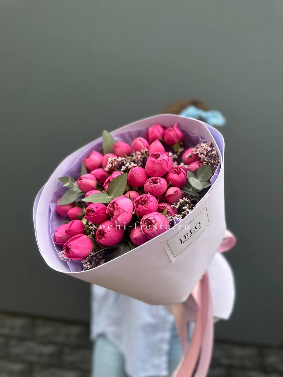 пионовидная кустовая кустовая роза Мисти Баблс, статица, лента, дизайнерская упаковка.
