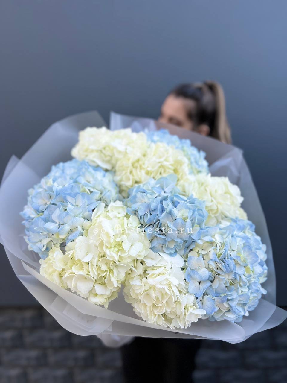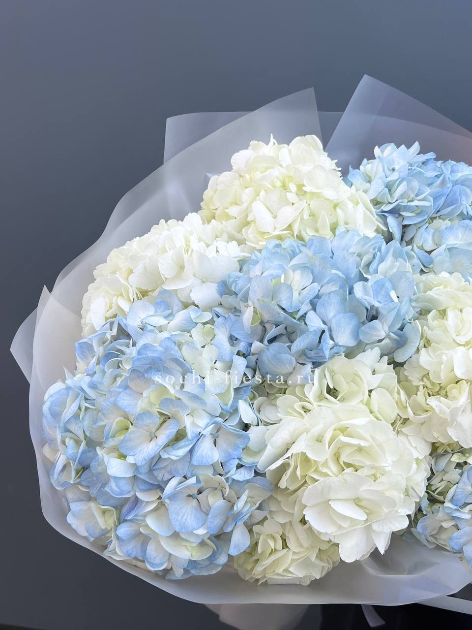 Девять пышных соцветий собраны в композицию с насыщенным объемом. Переход от белого к голубому создает глубину и движение внутри букета.