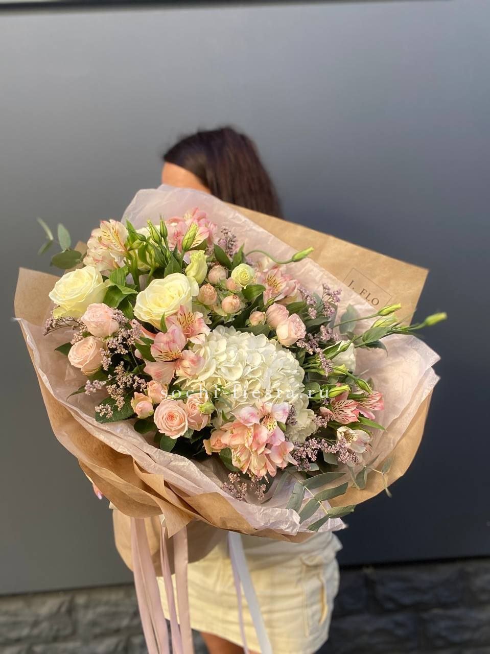 гортензия нежно-розовых оттенков, эустома, львиный зев или маттиола, розовые розы, эвкалипт, вспомогательная зелень, лента, светлая корзин.