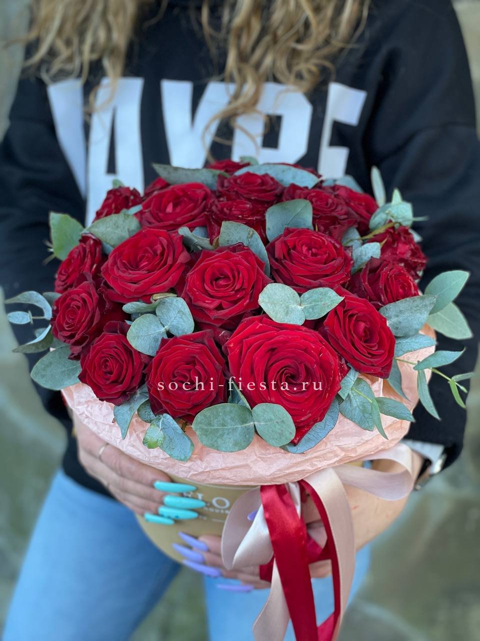 пионы, эвкалипт, лента и дизайнерская пленка.