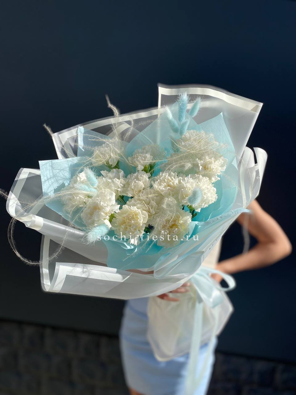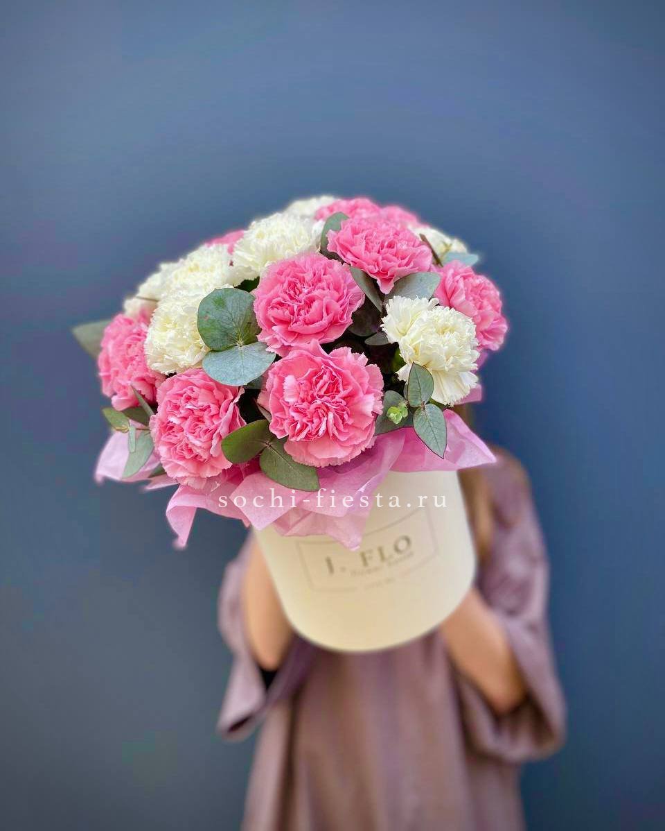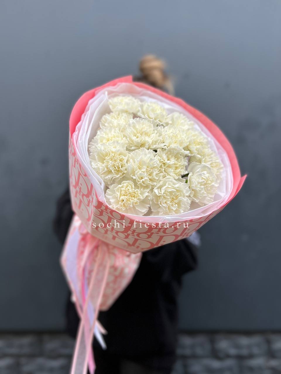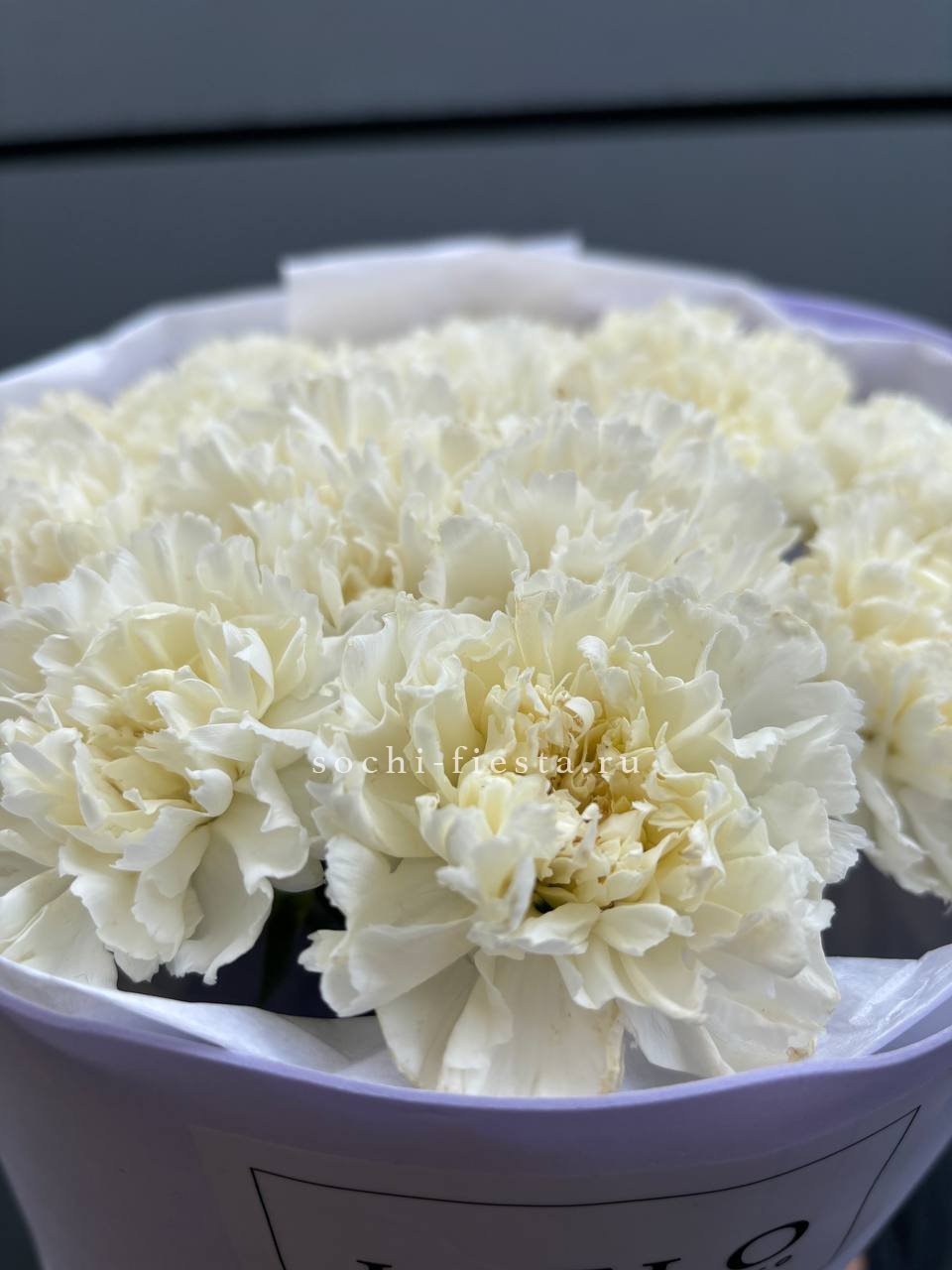 Букет из пятнадцати белых диантусов вписывается в любое пространство благодаря компактной форме. Цветы долго сохраняют свежесть и не требуют сложного ухода.
