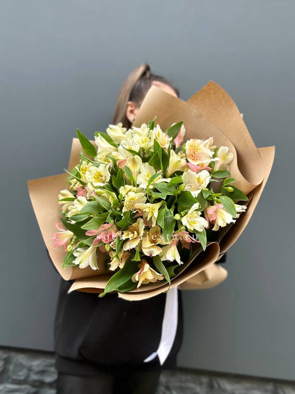 Букет из разноцветных альстромерий собран в свободной манере. Яркие оттенки перетекают друг в друга, создавая живую и динамичную композицию для современного интерьера.