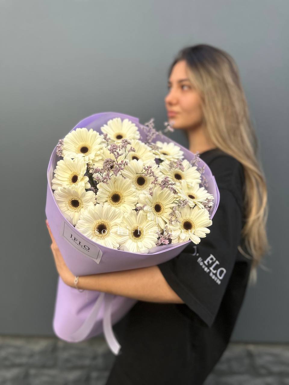 Семь крупных бутонов с открытой сердцевиной и упругими лепестками. Герберы из Голландии держат форму и радуют свежестью. Оттенок согласуется с вами перед сборкой.