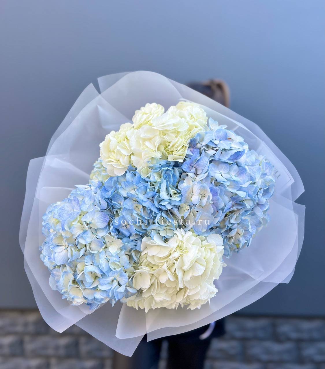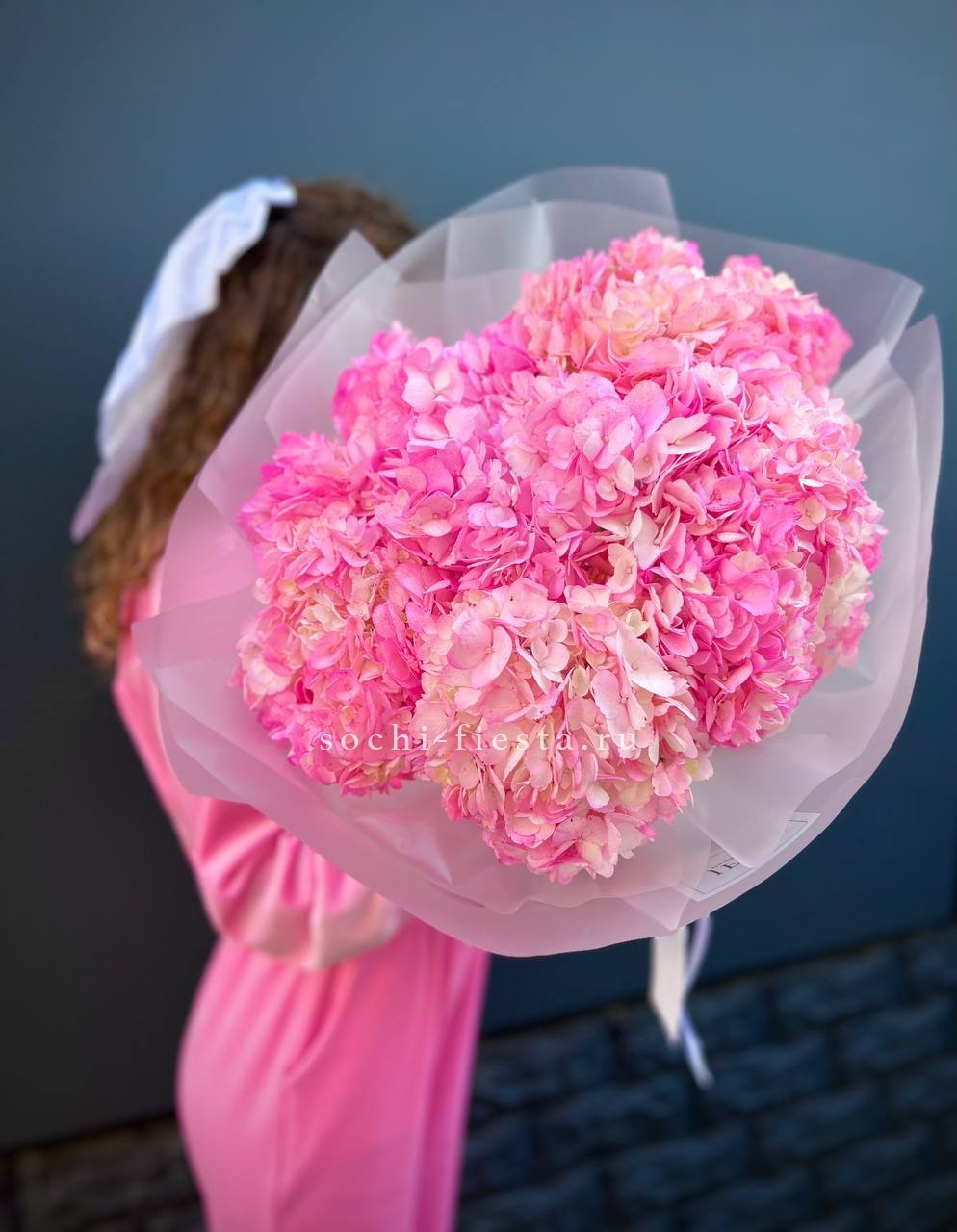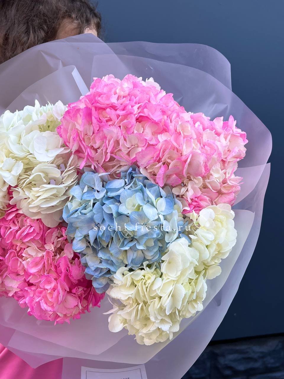 Букет из семи гортензий объединяет разные оттенки в единую композицию с живым ритмом. Переходы цвета создают динамику, а плотные соцветия формируют выразительный объём.