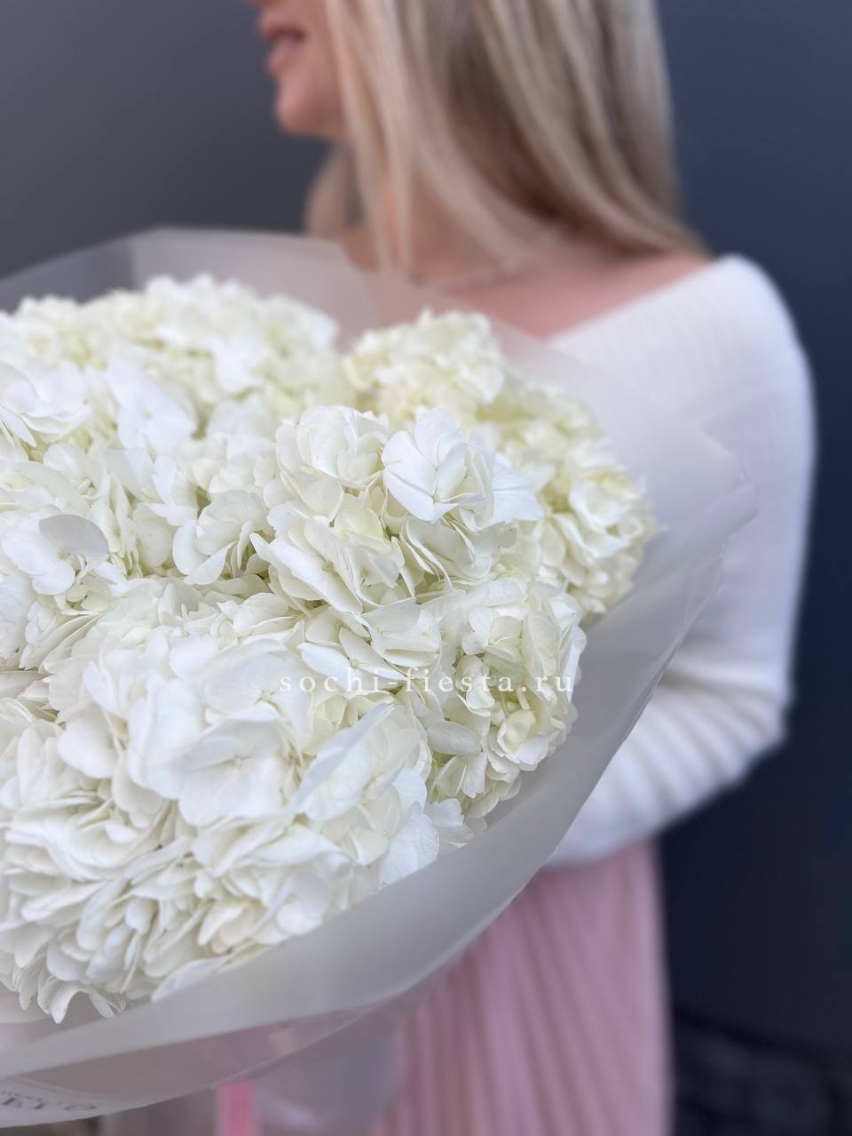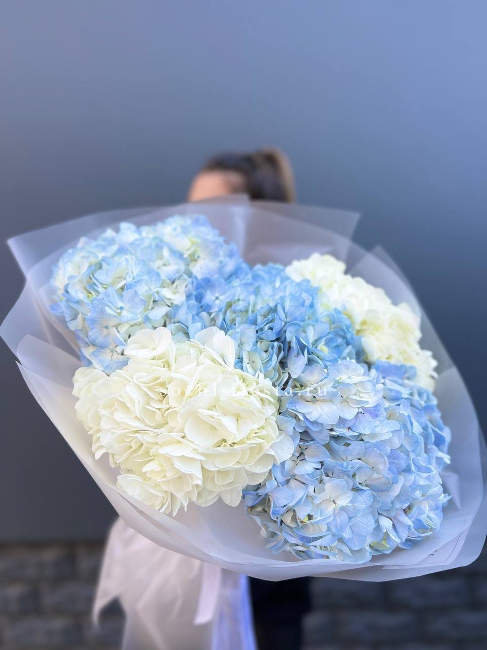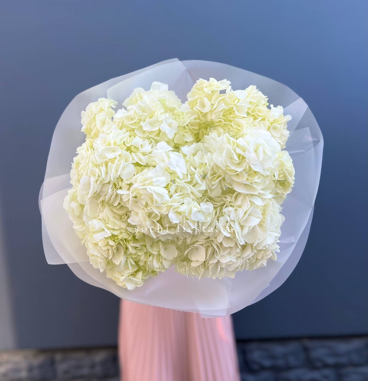 Букет из семи гортензий объединяет разные оттенки в единую композицию с живым ритмом. Переходы цвета создают динамику, а плотные соцветия формируют выразительный объём.