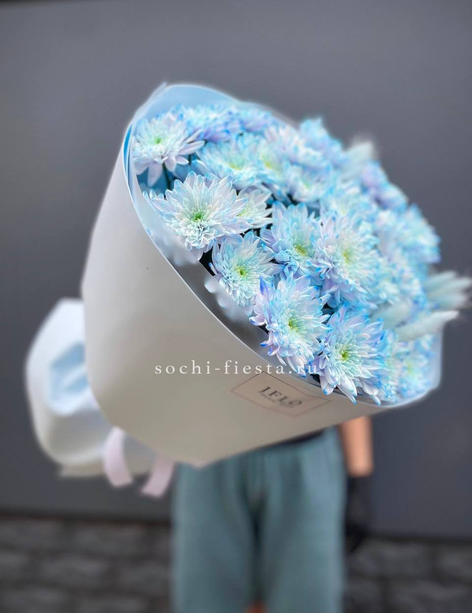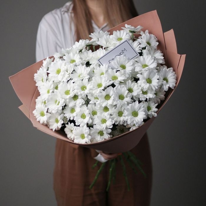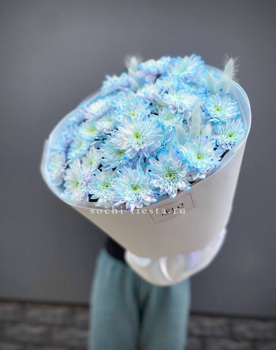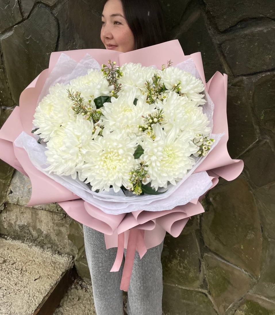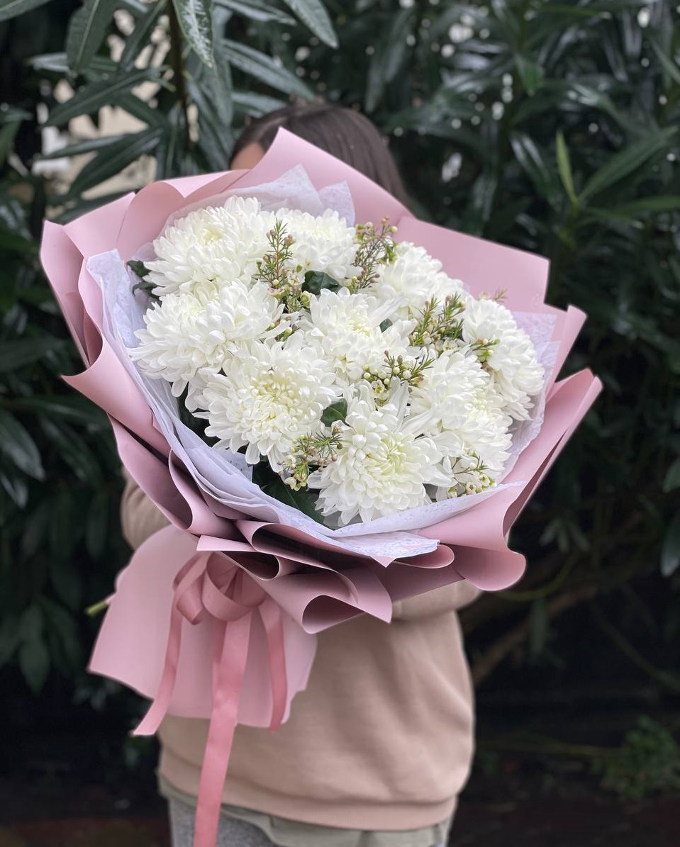 Семь веток кустовой хризантемы обрамлены лавандовым фоамираном, который мягко перекликается с оттенками бутонов. Композиция собрана свободно, сохраняя естественную пластику стеблей и живость форм.
