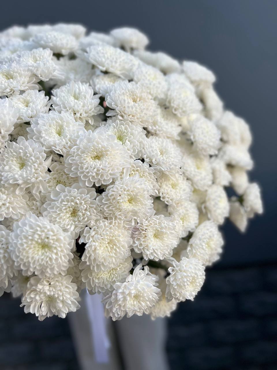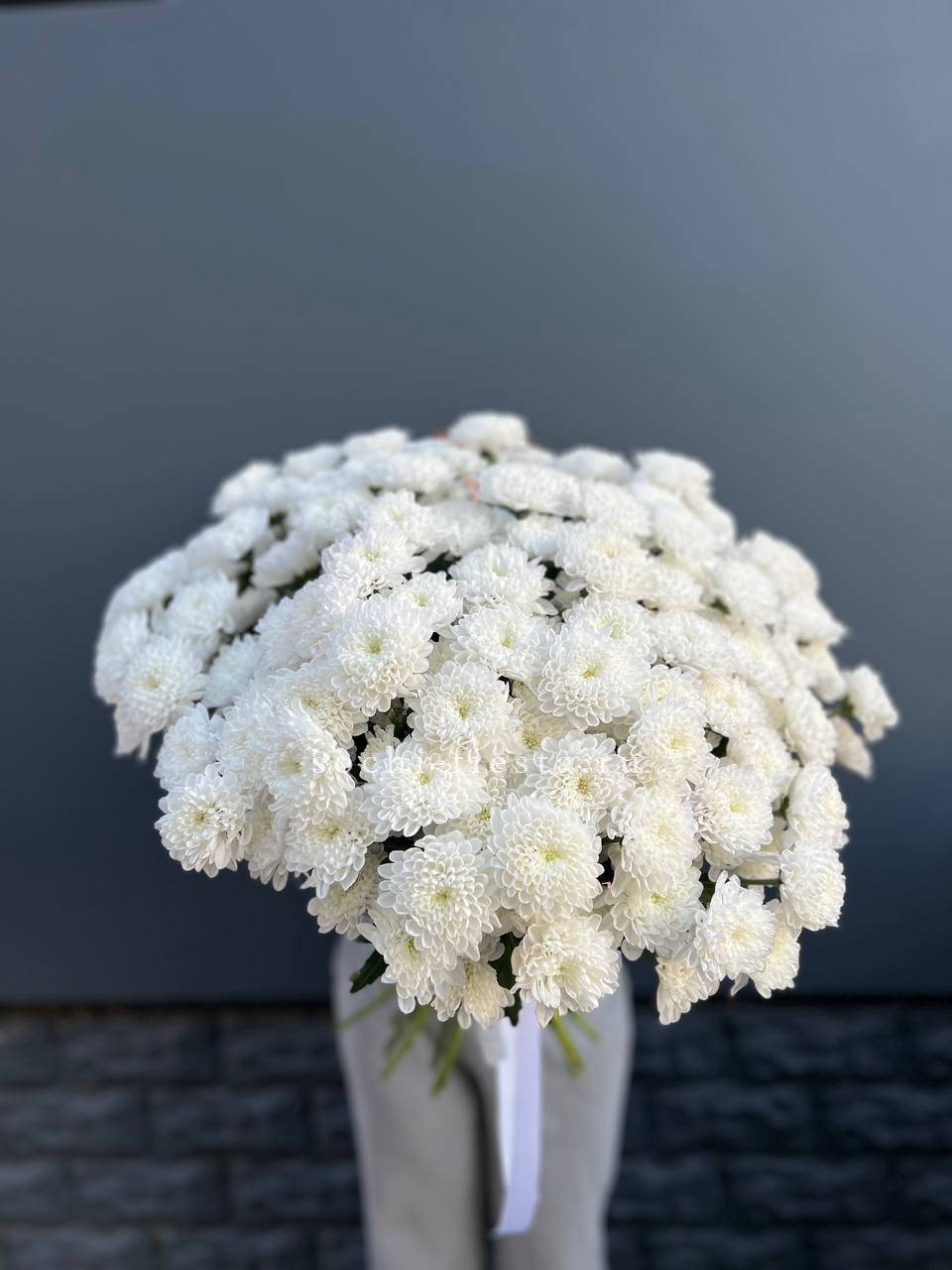 Fifteen веток кустовой хризантемы образуют пышное облако из множества мелких бутонов. Простая упаковка не отвлекает от густоты соцветий и их природной фактуры. Букет долго сохраняет свежесть и объём.