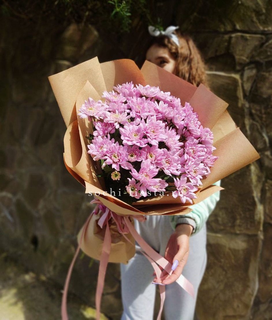 хризантема одноголовая - 9 шт., хамелациум, 5-7 шт., лента, дизайнерская упаковка.