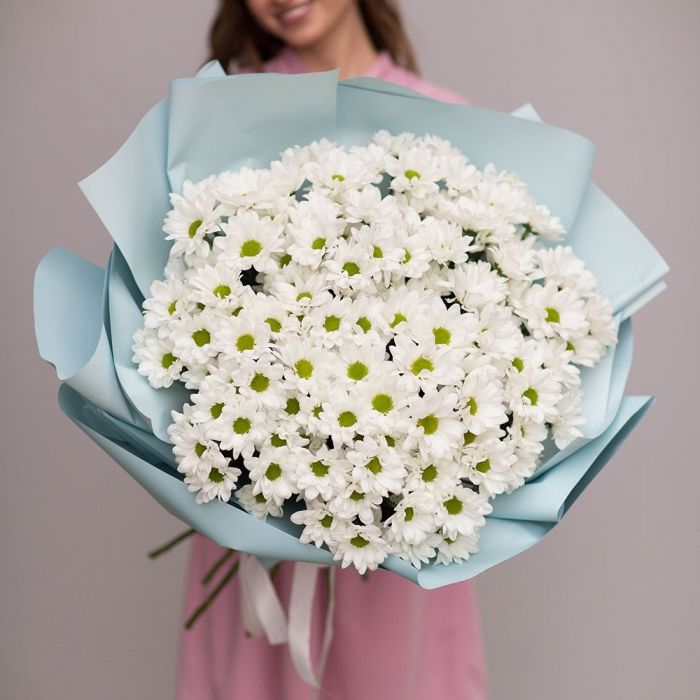 Тридцать девять белоснежных хризантем образуют плотное облако с чёткими графичными линиями. Крупные соцветия создают объёмную структуру, которая держит форму и привлекает внимание своей архитектурой.