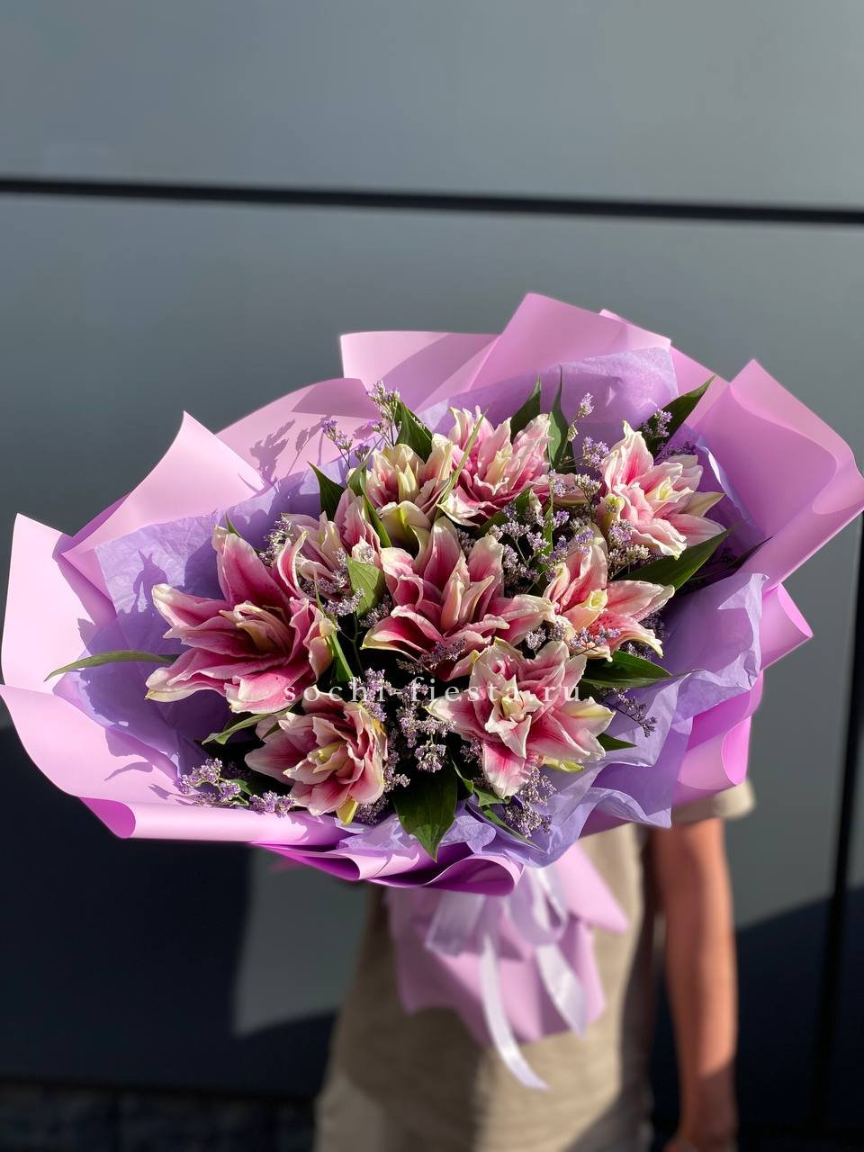 Пионовидные лилии с махровыми бутонами дополнены воздушным лимониумом. Девять стеблов образуют пышную форму, где каждый цветок раскрывается слоями.