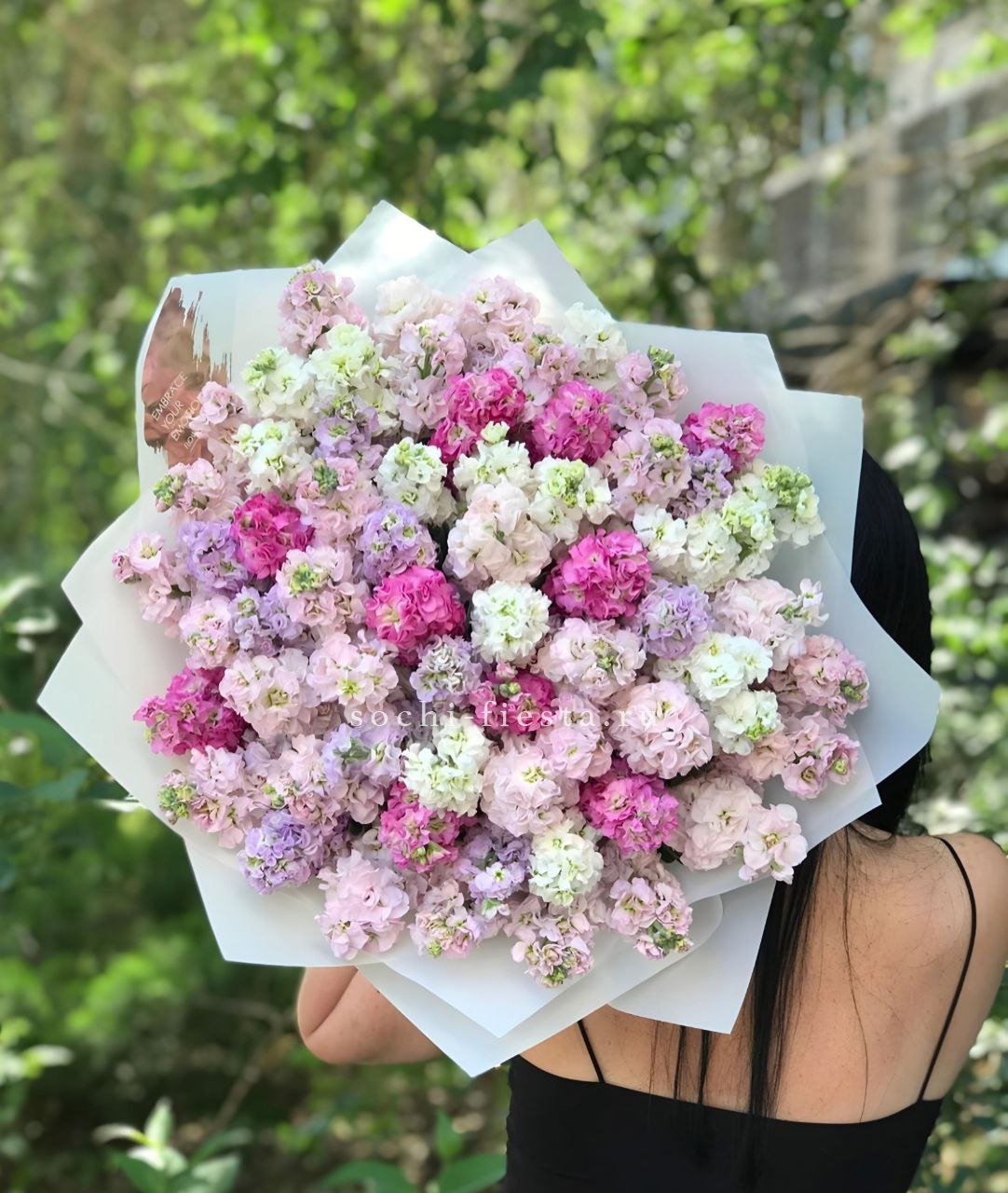 Пятьдесят один стебель маттиолы собран в объёмную композицию с воздушным силуэтом. Соцветия создают мягкую текстуру и заполняют пространство лёгкой дымкой цвета.