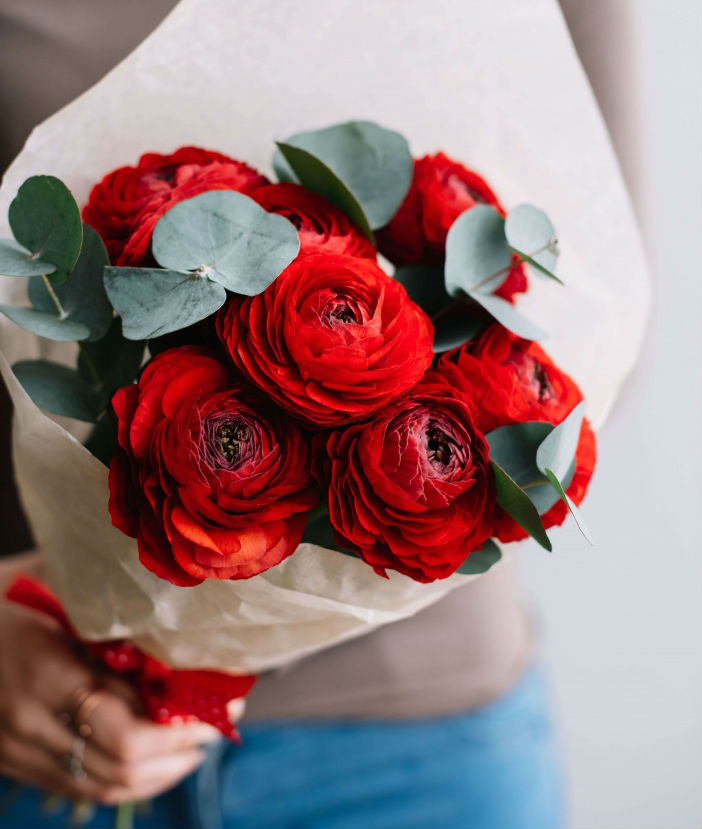 Девять красных ранункулюсов собраны в яркую композицию с зеленью эвкалипта. Глубокий оттенок бутонов притягивает взгляд и наполняет пространство энергией.
