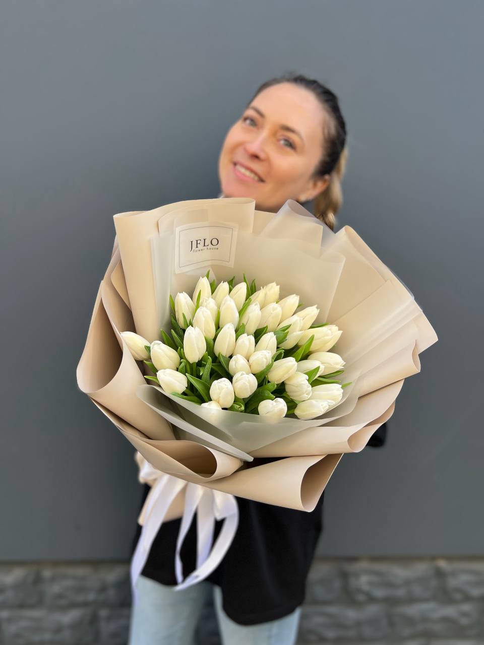 Тридцать пять тюльпанов собраны в плотный монохромный букет, где белизна лепестков создаёт почти графичное впечатление. Чистая форма без лишних деталей позволяет раскрыться природной архитектуре каждого бутона.