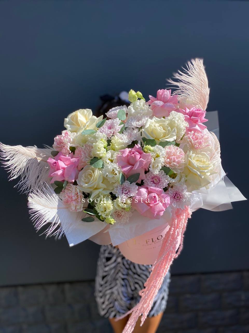 Перья и амарантус добавляют композиции воздушности и движения между французскими розами и хризантемами. Эустома и диантусы смягчают силуэт и создают многослойную фактуру в высоком боксе.