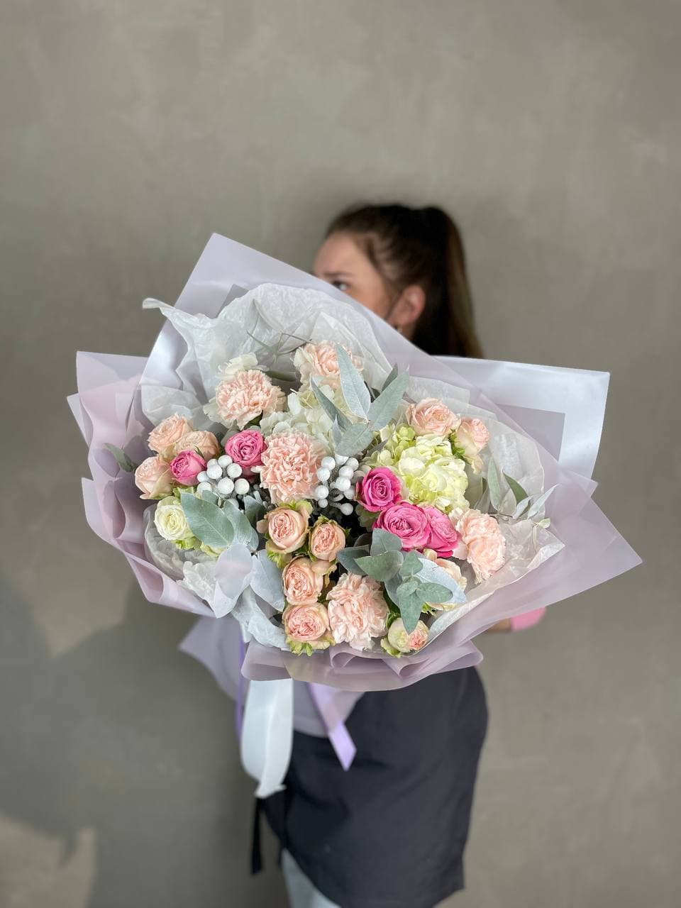 Пышные шапки гортензии и кустовые розы образуют плотную композицию с выраженным объёмом. Серебристая бруния и эвкалипт добавляют графичности, а диантусы разбивают крупные формы лёгкими вкраплениями. Авторская сборка с продуманной структурой и естественной пластикой.