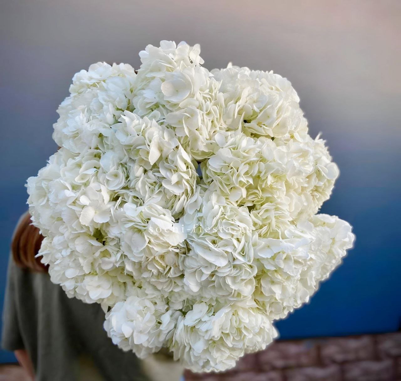 Пышные шапки гортензии создают объёмную основу, сквозь которую проступают розы и герберы. Букет плотно собран, каждый цветок находит своё место в общей структуре. Эвкалипт добавляет воздушности по краям композиции.