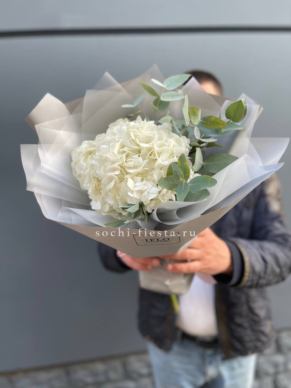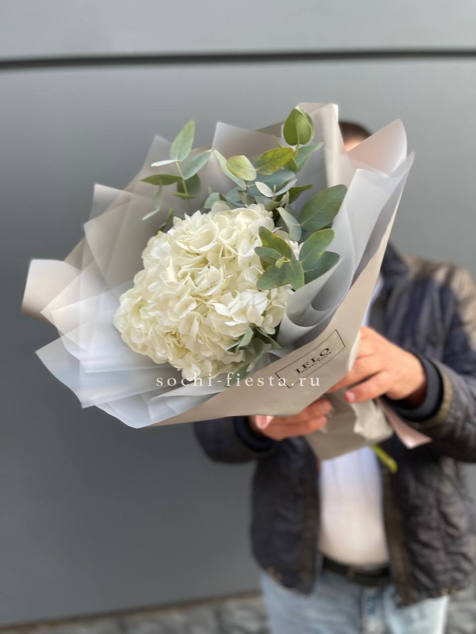 Гортензия и кустовые розы соединяются с веточками эвкалипта и ваксфлауэра в свободной композиции. Разная плотность соцветий создаёт живой ритм и природную лёгкость.