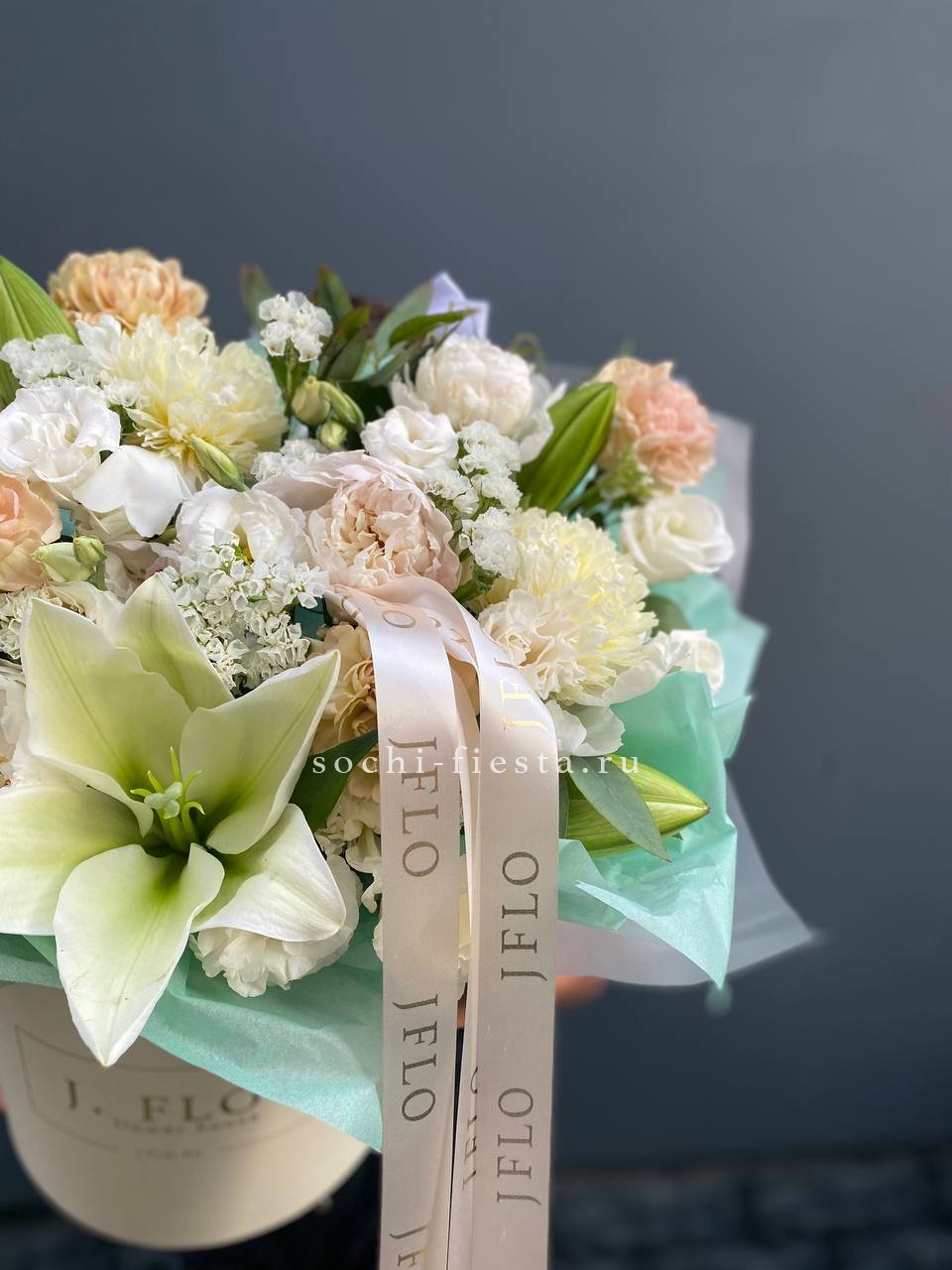 лилии, диантусы, статица, пионы или замена в не сезон эвкалипт, цилиндр.Состав может меняться в зависимости от сезона.