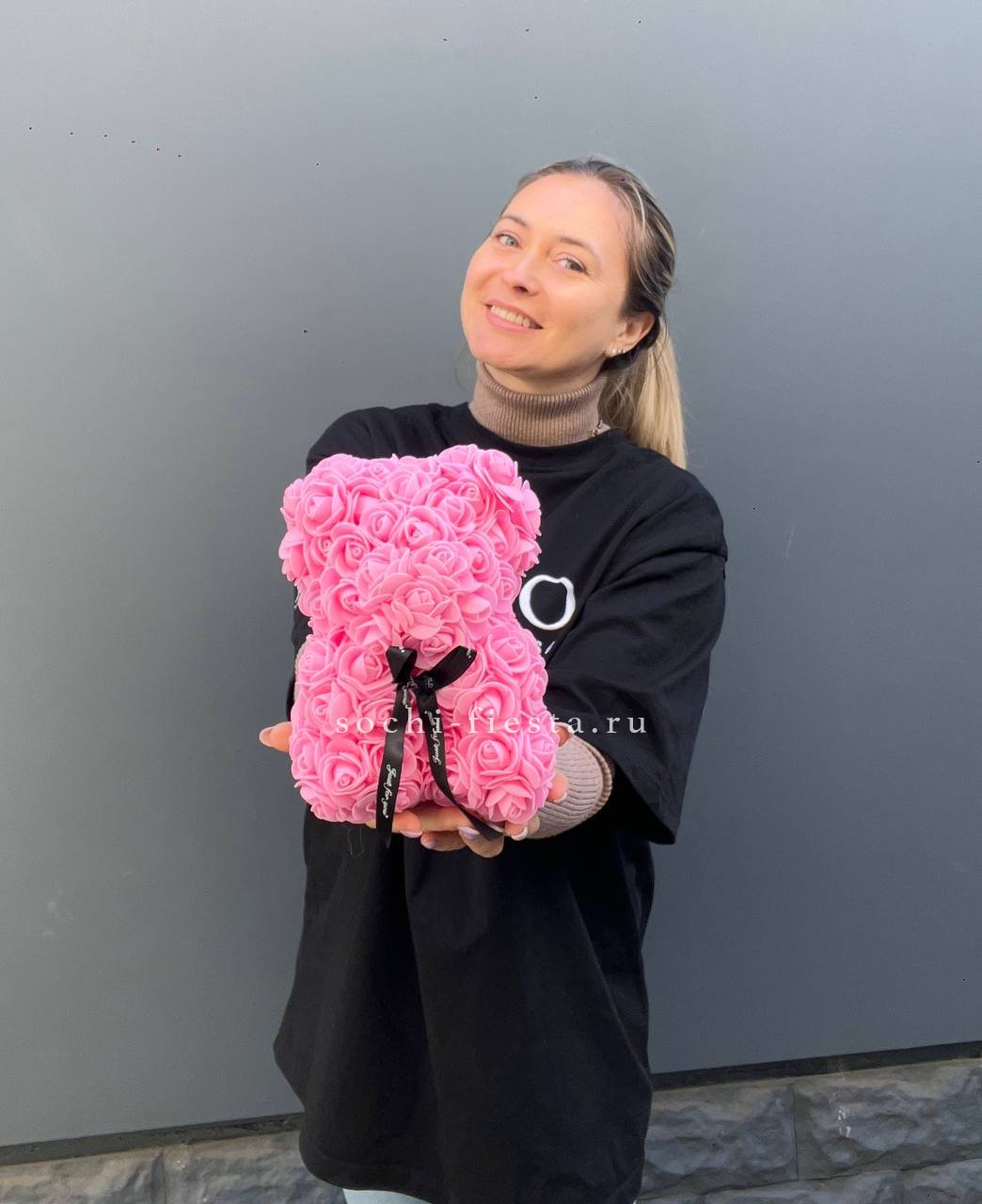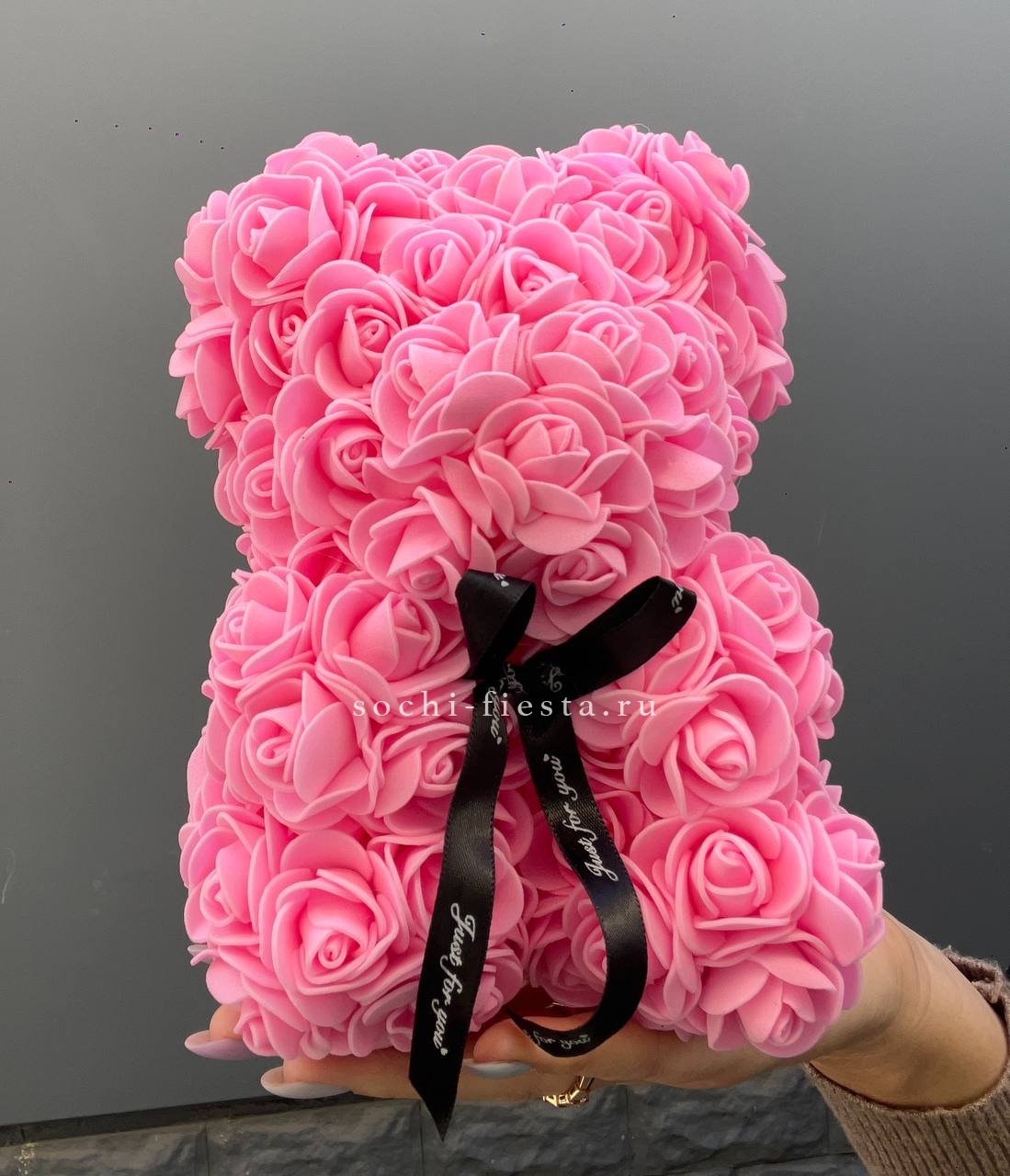 Розовый медведь из плотно уложенных лепестков фоамирана. Округлая форма и равномерная текстура создают объёмную фигурку, приятную на ощупь и долговечную в использовании.