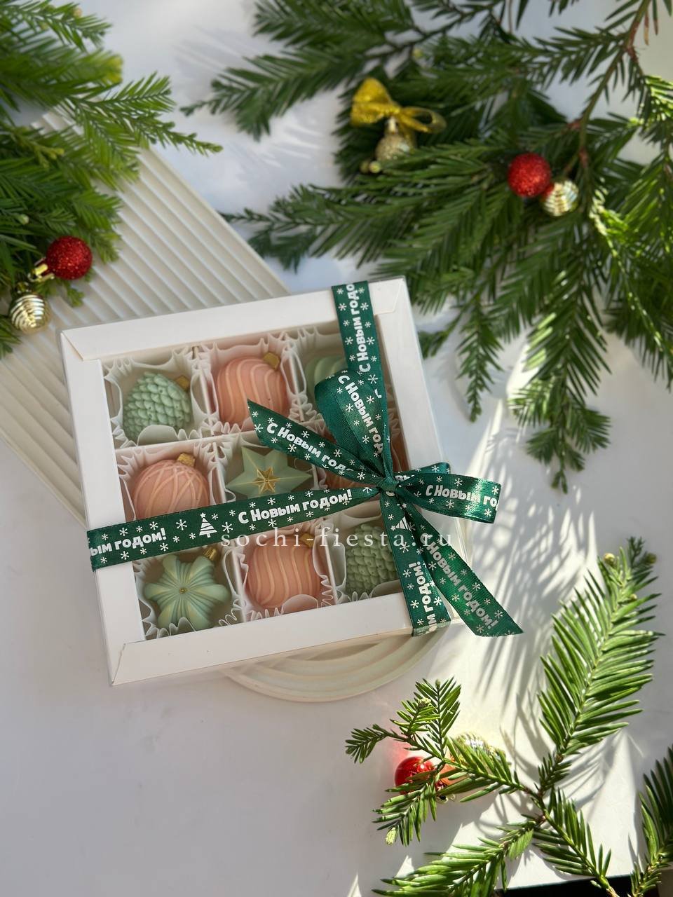 Девять елочных шаров из бельгийского шоколада с авторской росписью. Пастельные тона и ручное декорирование превращают набор в самостоятельный акцент праздничного стола.