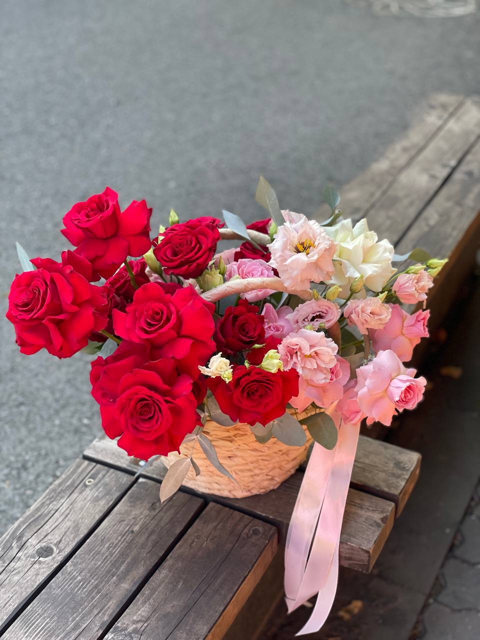 Розовые и алые головки роз собраны в плетёную корзину вместе с воздушной эустомой и серебристым эвкалиптом. Композиция держит форму и легко помещается на столе или комоде.