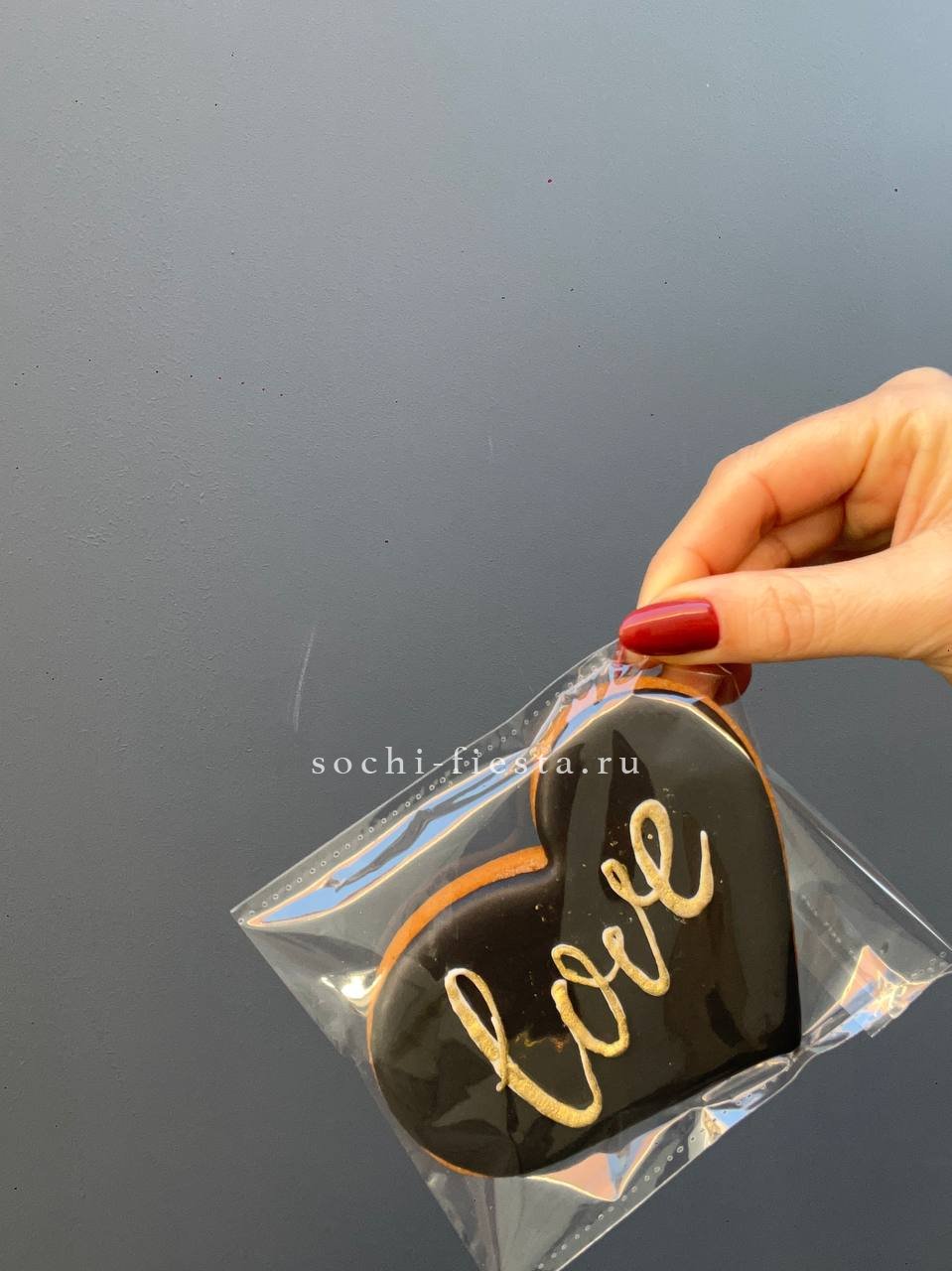 Пряник с ручной росписью готов дополнить цветочную композицию. Каждый рисунок уникален, а сама форма держит четкие края и аккуратные линии глазури.