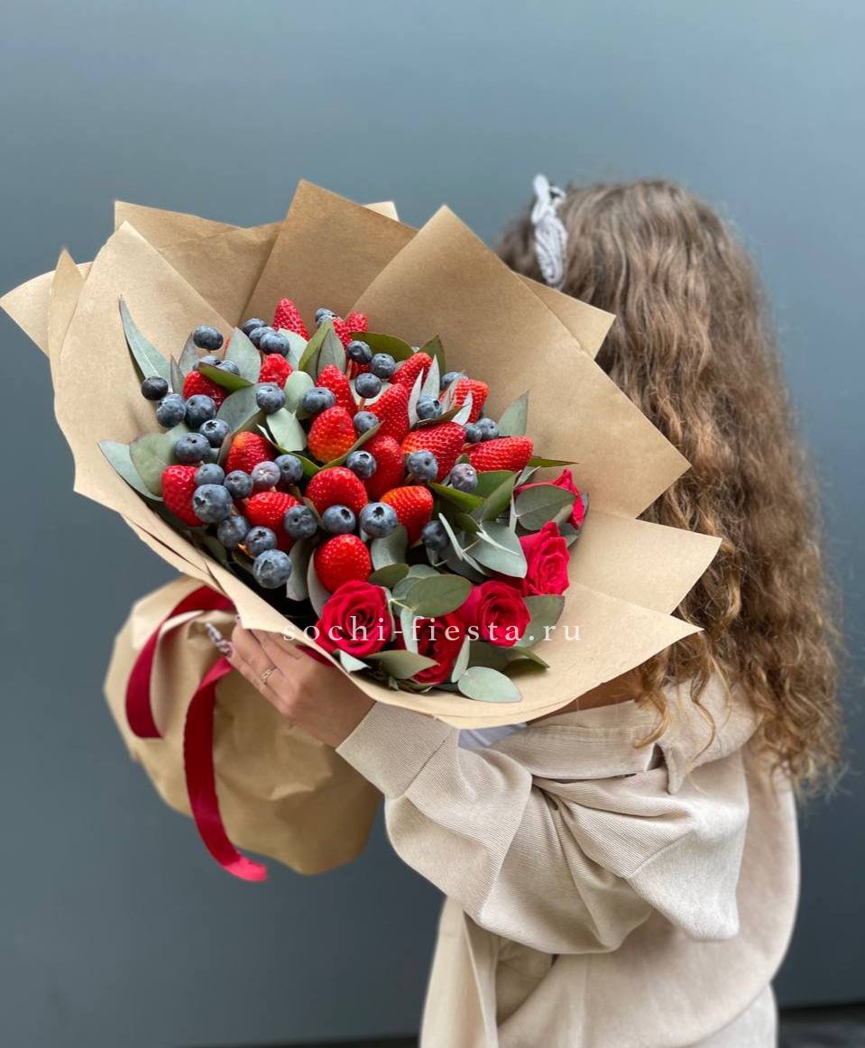 Пять алых роз соседствуют со свежей клубникой и россыпью голубики в естественной крафтовой обёртке. Зелень фисташки добавляет композиции лёгкости и воздуха. Сезонное сочетание цветов и ягод в одном букете.