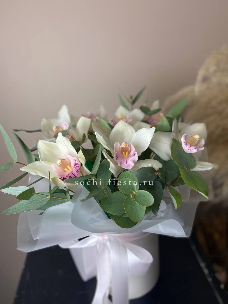 орхидея цимбидиум, эвкалипт, цилиндр, оазис.