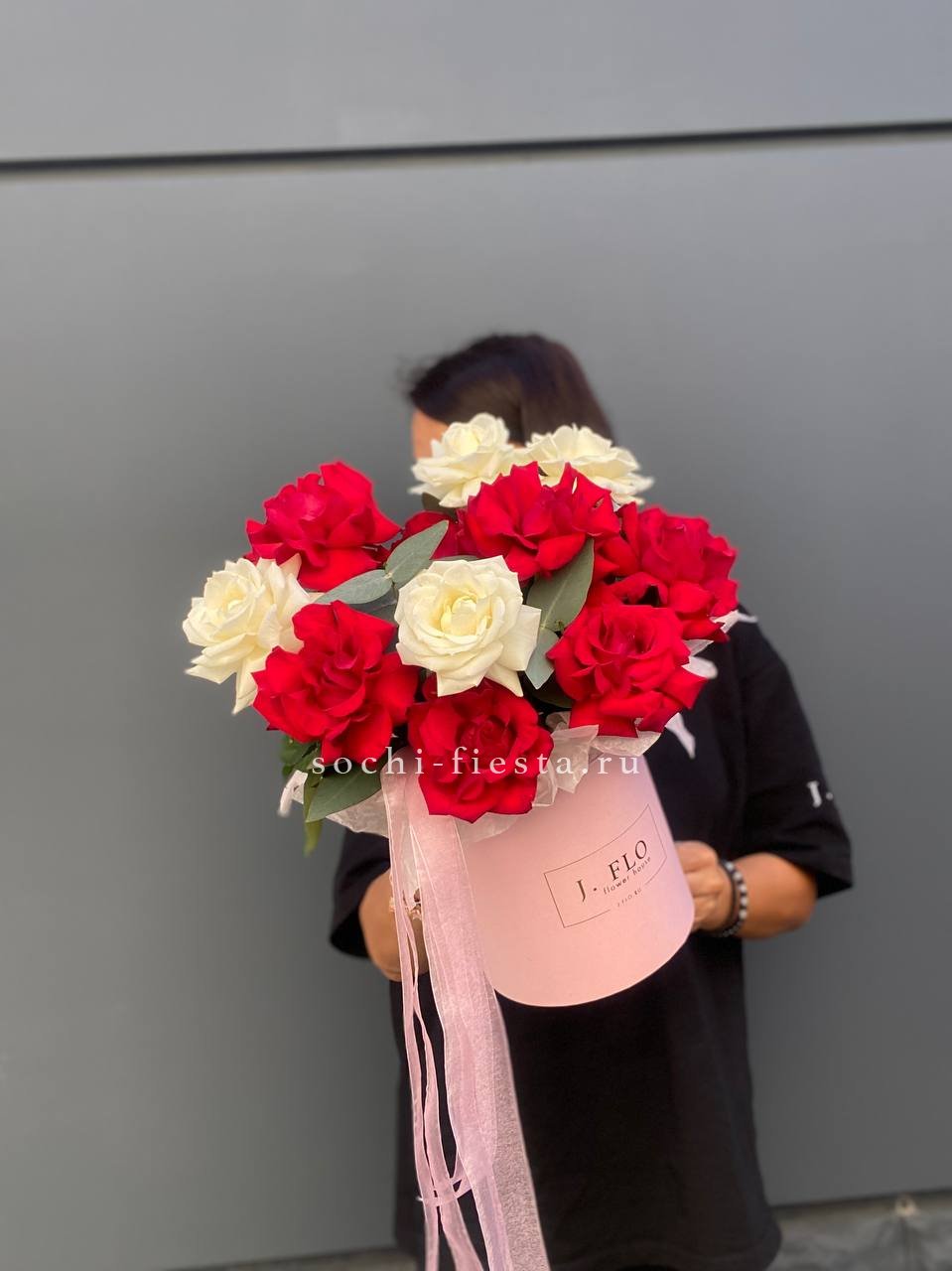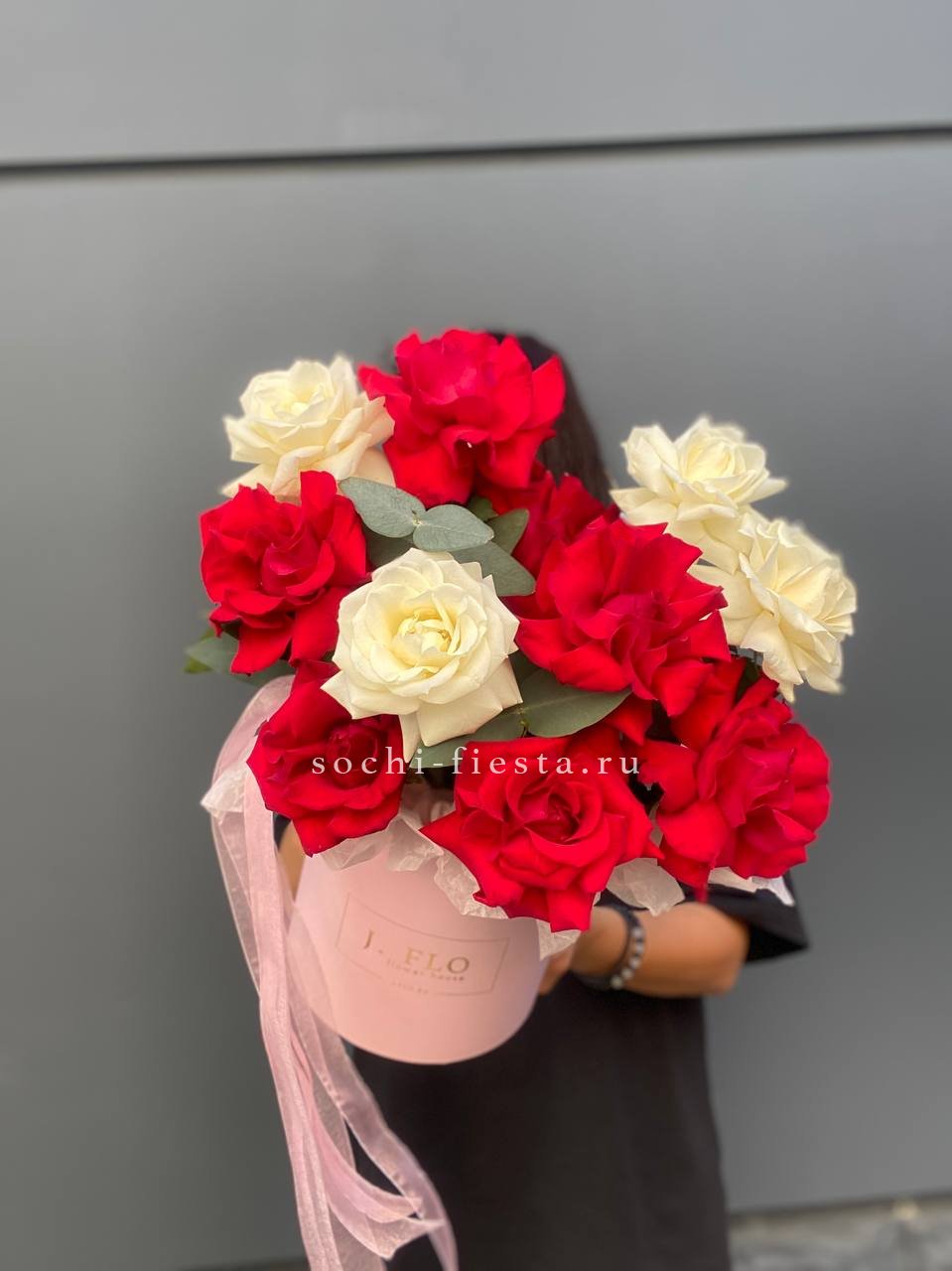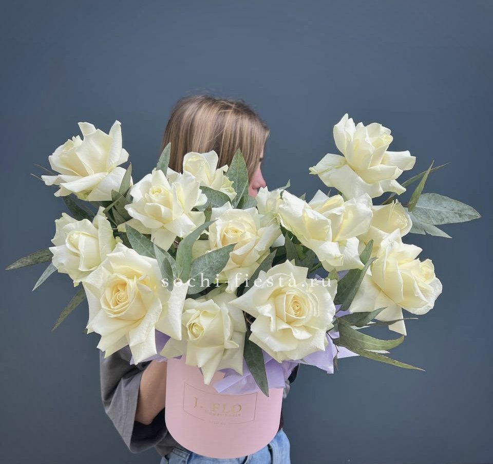 Пионовидная роза Бомбастик образует плотные бутоны с множеством лепестков. Эвкалипт добавляет свежести и завершает форму. Компактная коробка удобна для передачи из рук в руки.