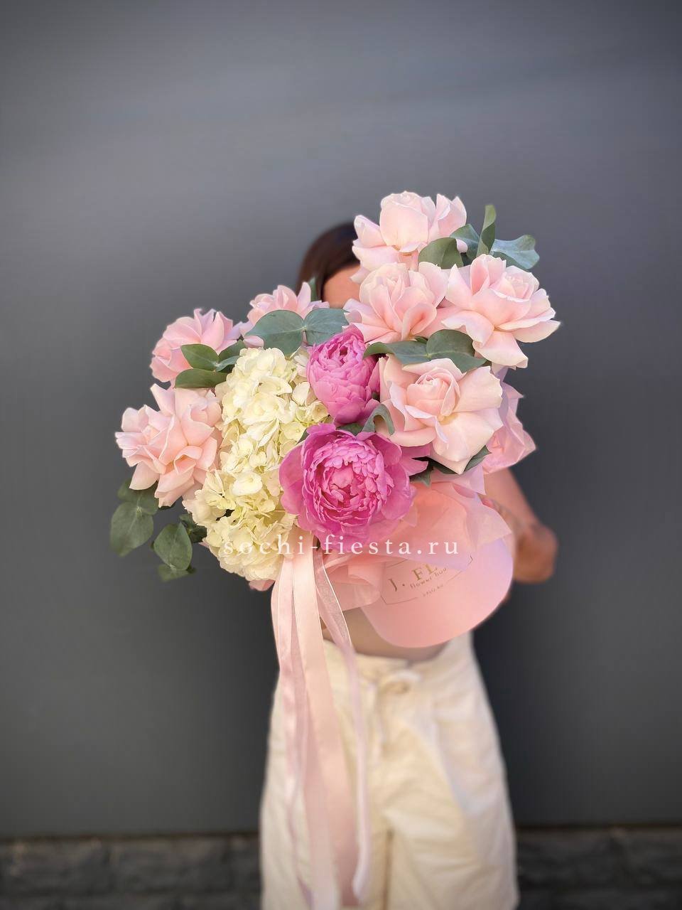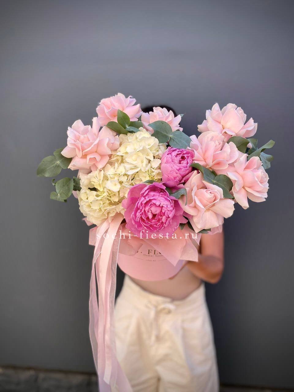 Пионы и гортензии наполняют композицию объемом и мягкой фактурой лепестков. Цилиндр собирает цветы в плотную форму, где каждый бутон находит свое место в общем движении.