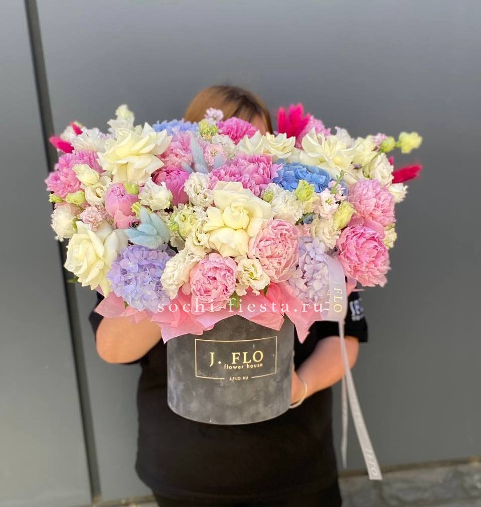пионы, маттиола, эустома, белые розы, лента, гортензия, цилиндр D20.