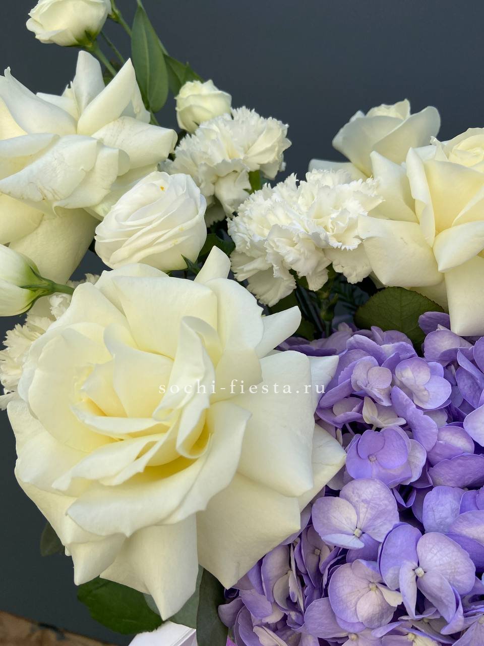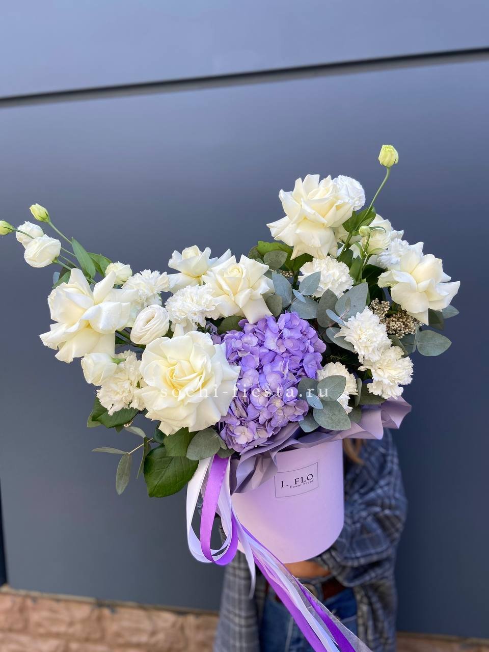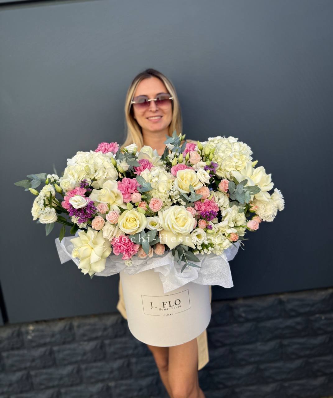 Настоящий взрыв цвета и позитива! Эта пышная и многосоставная композиция в стильной коробке притягивает взгляды богатством форм и оттенков — от нежно-розового до насыщенного белого. Это не просто цветы, а целая история о радости, празднике и восхищении. Подарок, который гарантированно произведет яркое впечатление и останется в памяти надолго.