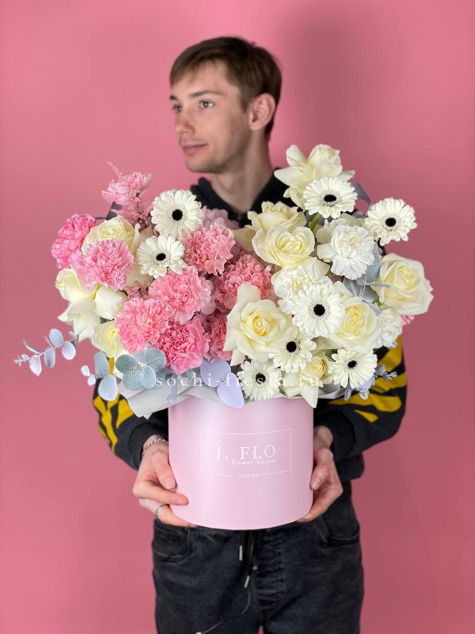 Белоснежные розы и герберы выстраивают чистую цветовую гамму с яркими акцентами диантусов. Эвкалипт вносит графичность и природную фактуру в общую композицию.