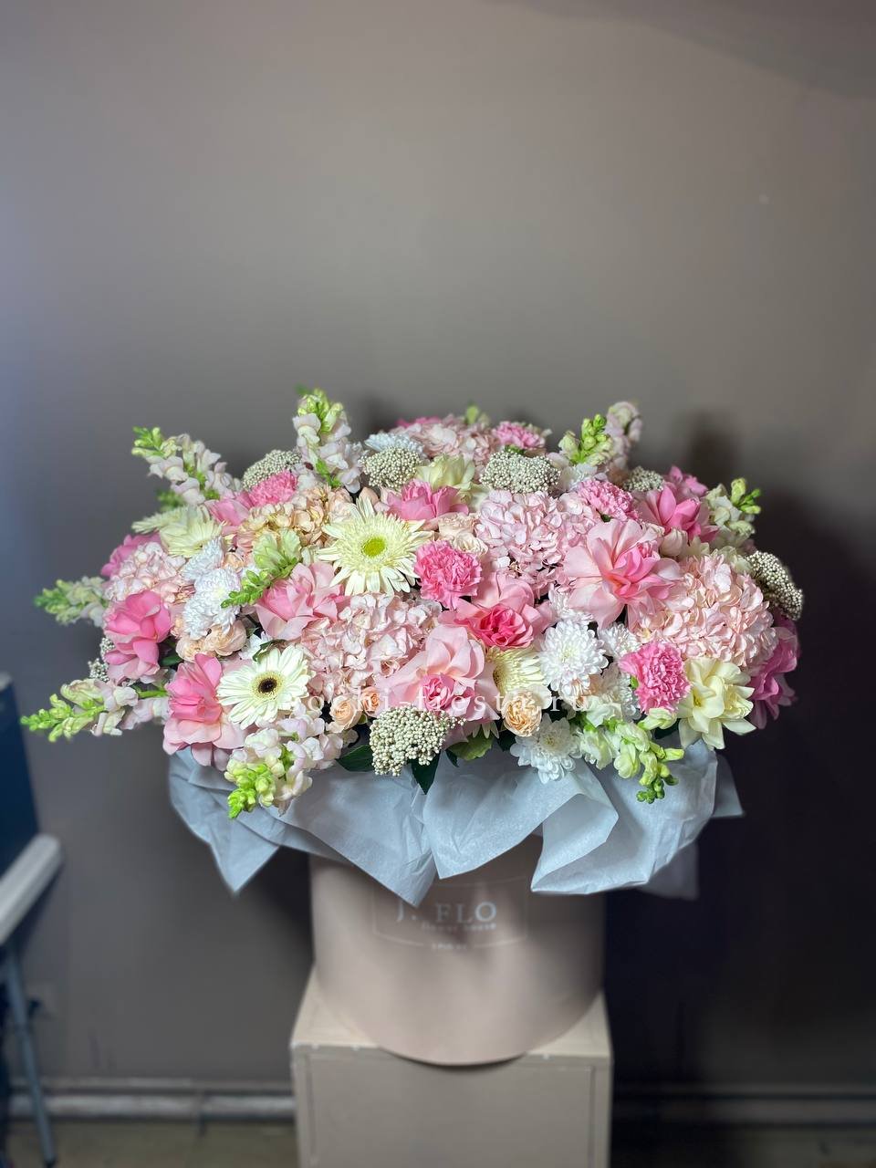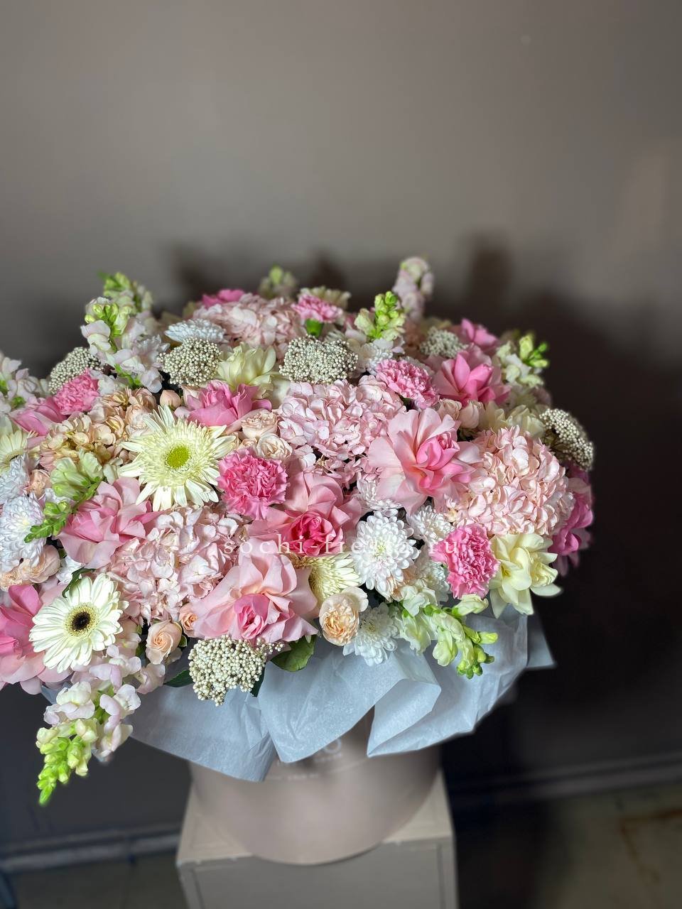 Розовая палитра переходит от французских роз к кустовым Джульетта с добавлением хлопка. Композиция в цилиндре сочетает воздушность и плотность фактур.