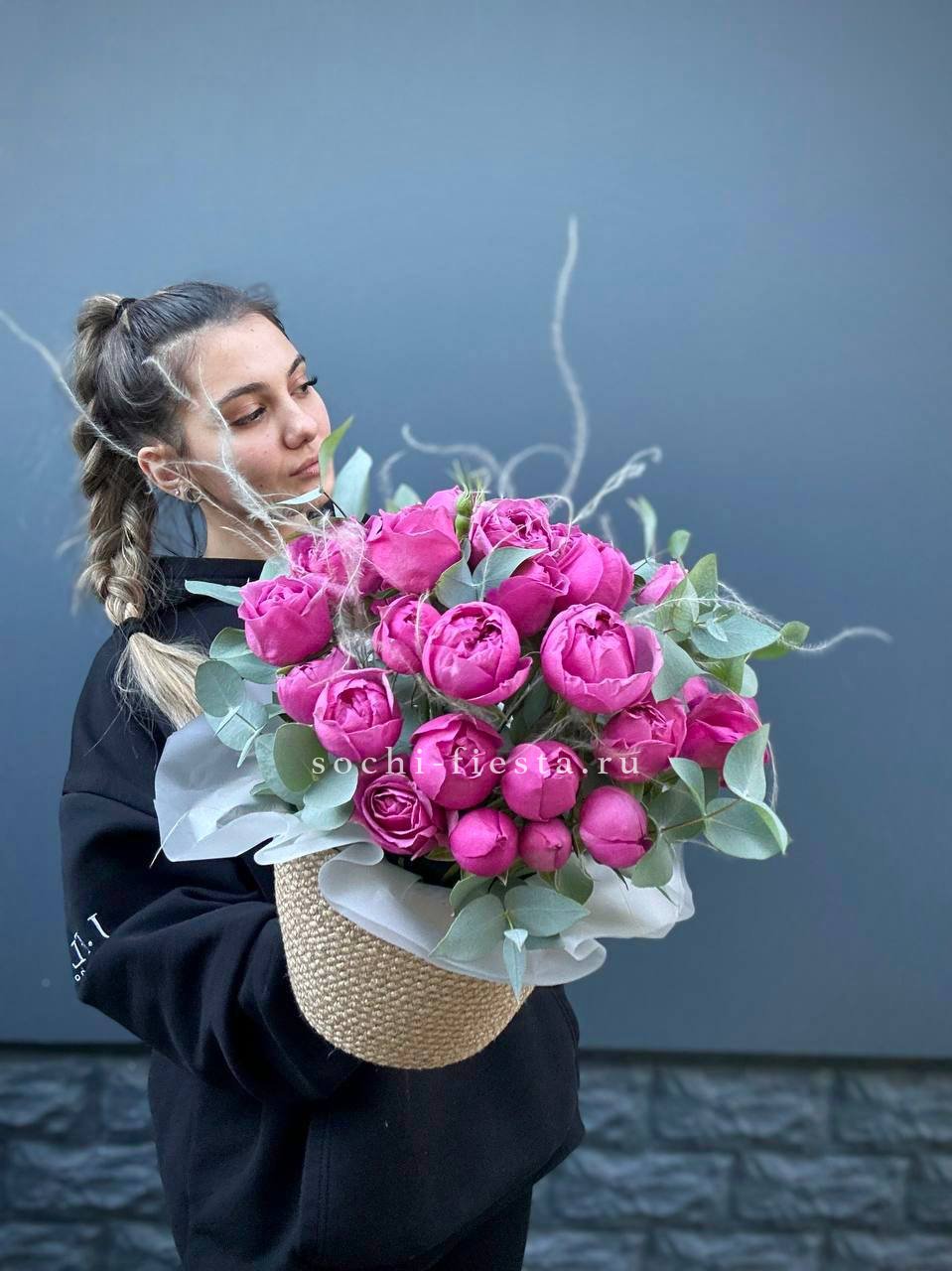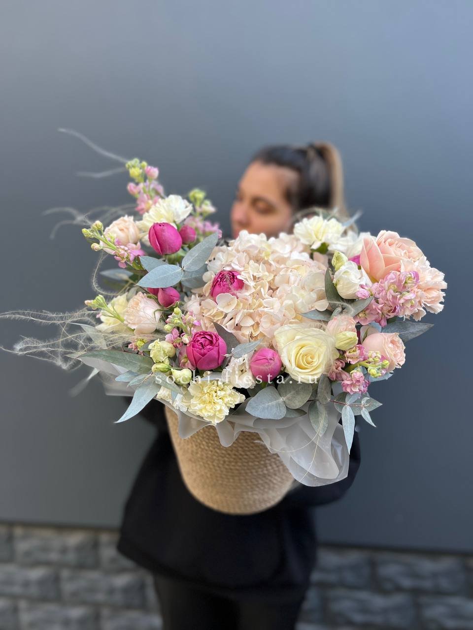 Яркие герберы встречаются с французскими розами в окружении маттиолы и диантусов. Амарант и эвкалипт завершают многоцветную композицию в натуральном джутовом кашпо.