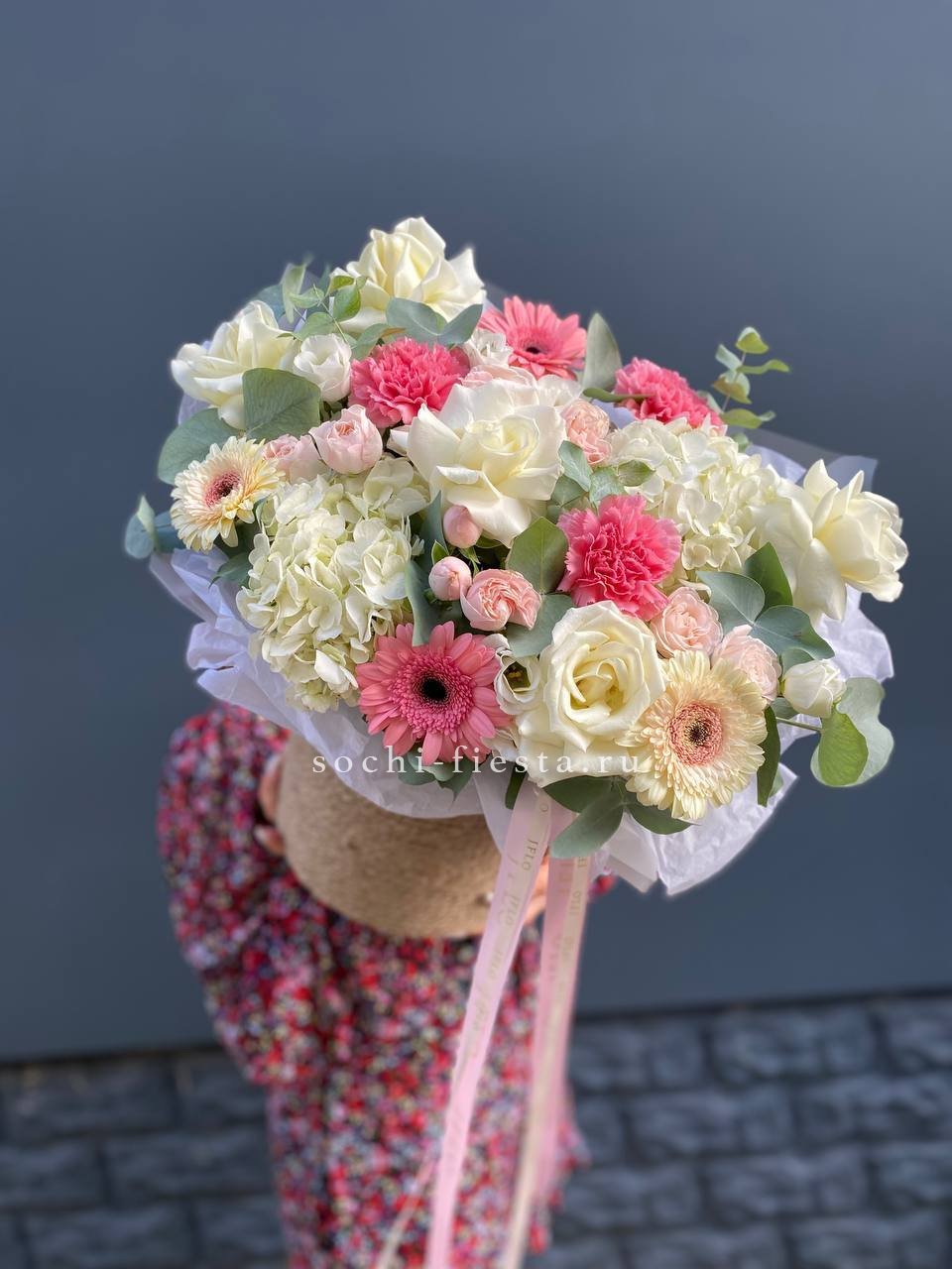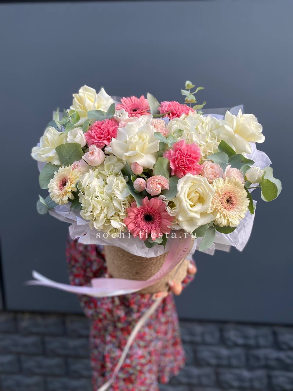 герберы, французские розы, маттиола (аналог), диантусы, амарант и эвкалипт. Цвет роз и диантусов могут отличаться, в тон композиции.