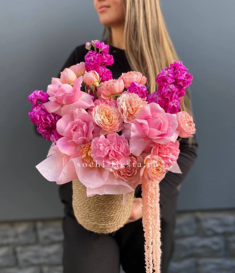 маттиола, французские розы, кустовые пионовидные розы, дианутсы, амарантус.