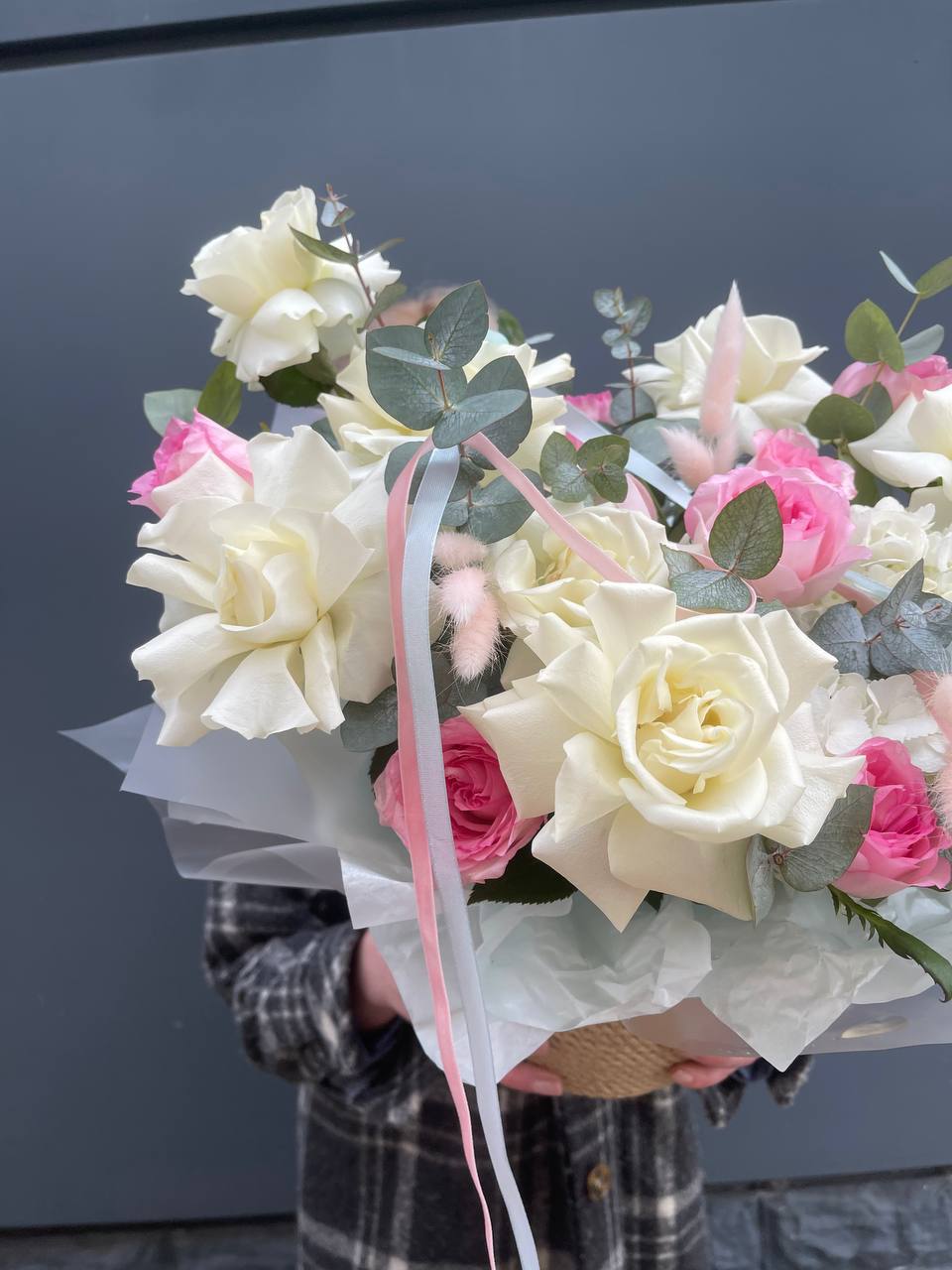 Воздушная композиция в натуральном джутовом кашпо с белыми розами и эустомой. Диантусы добавляют объема и делают форму округлой. Готовое решение для размещения на столе или комоде.