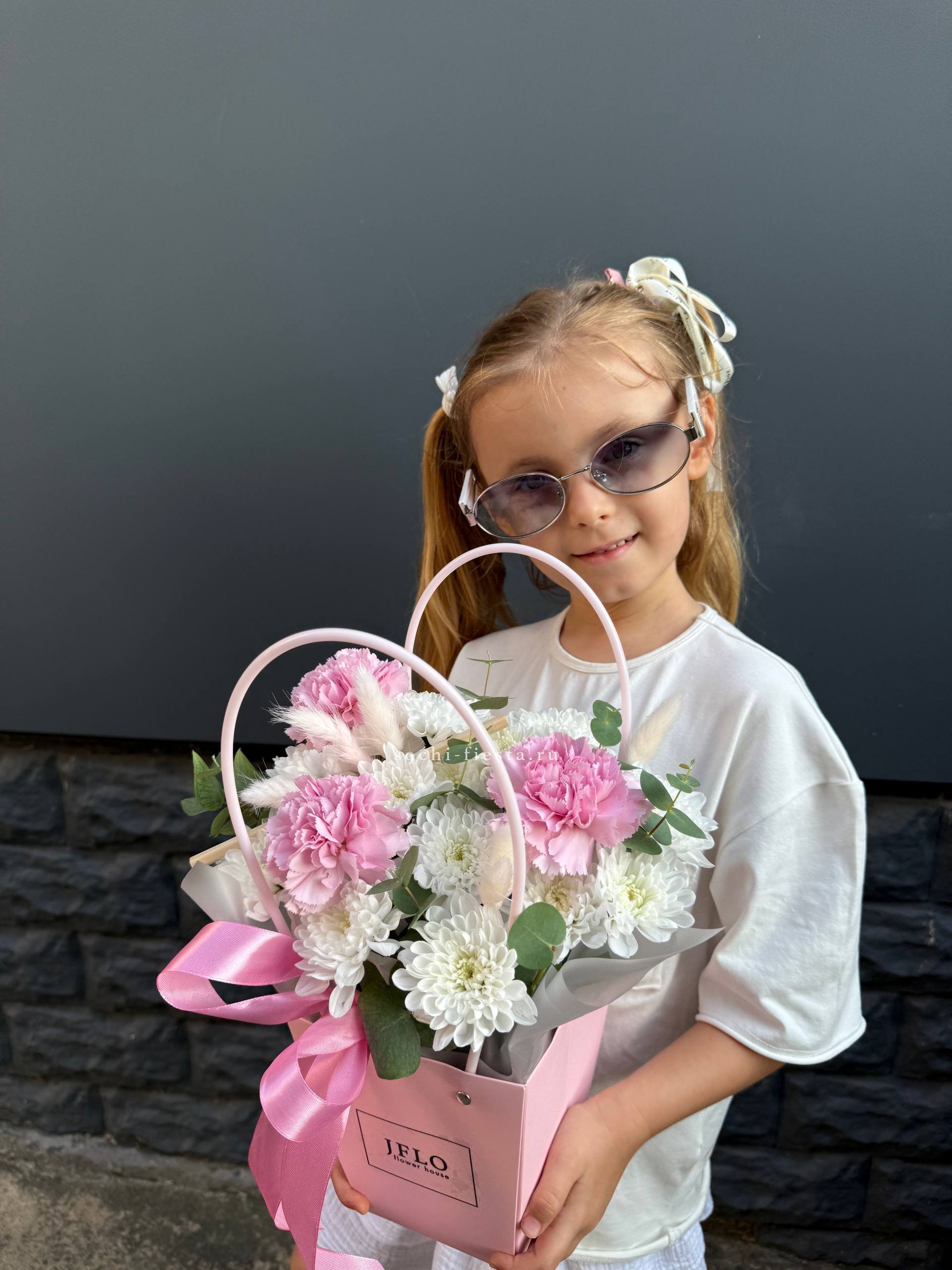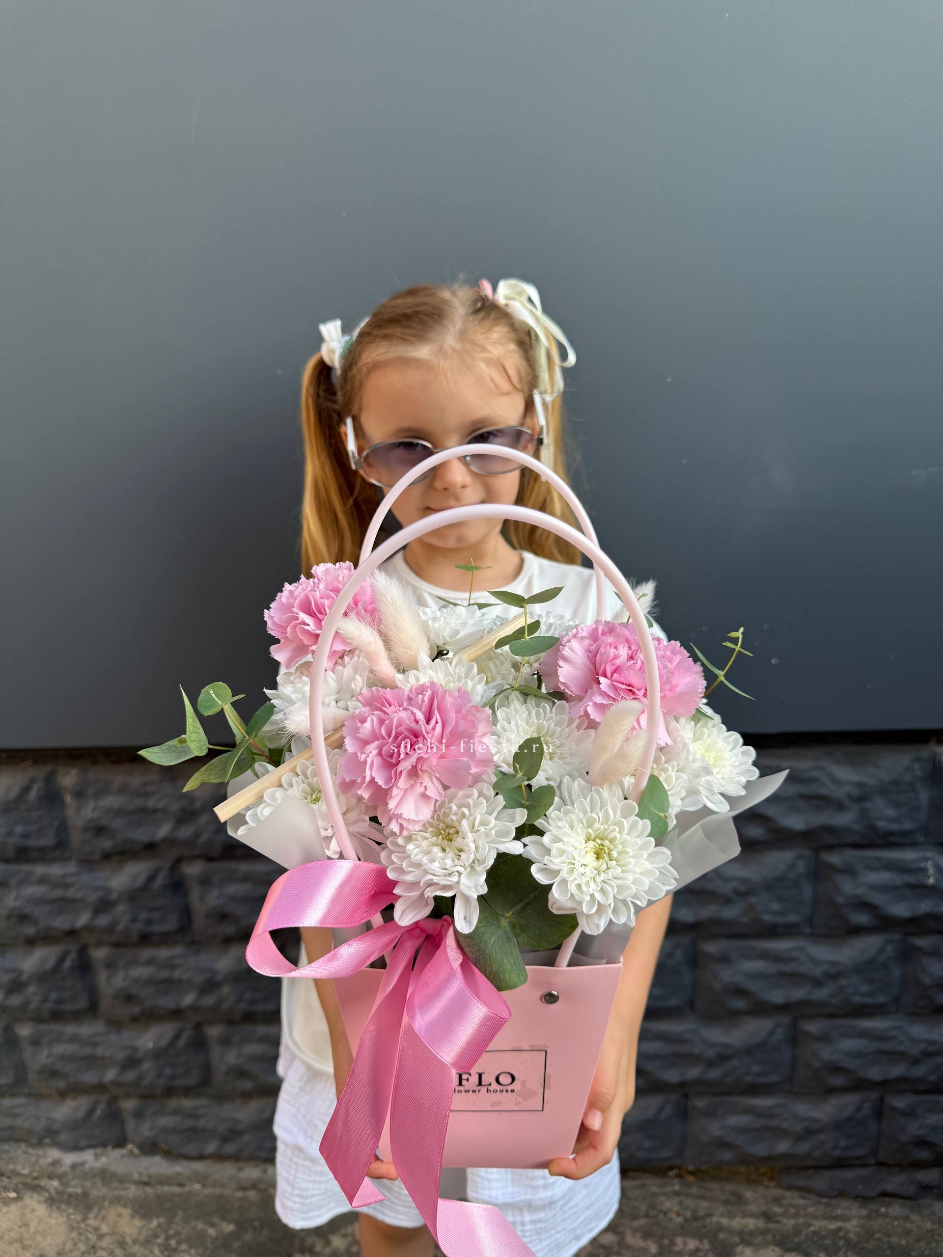 Гортензии задают плотную основу, герберы и диантусы вносят ритм, а альстромерии с эустомой создают движение вверх. Разнообразие форм и оттенков выстраивает многослойную картину в одной сумке.