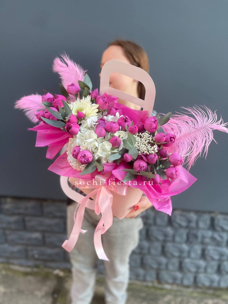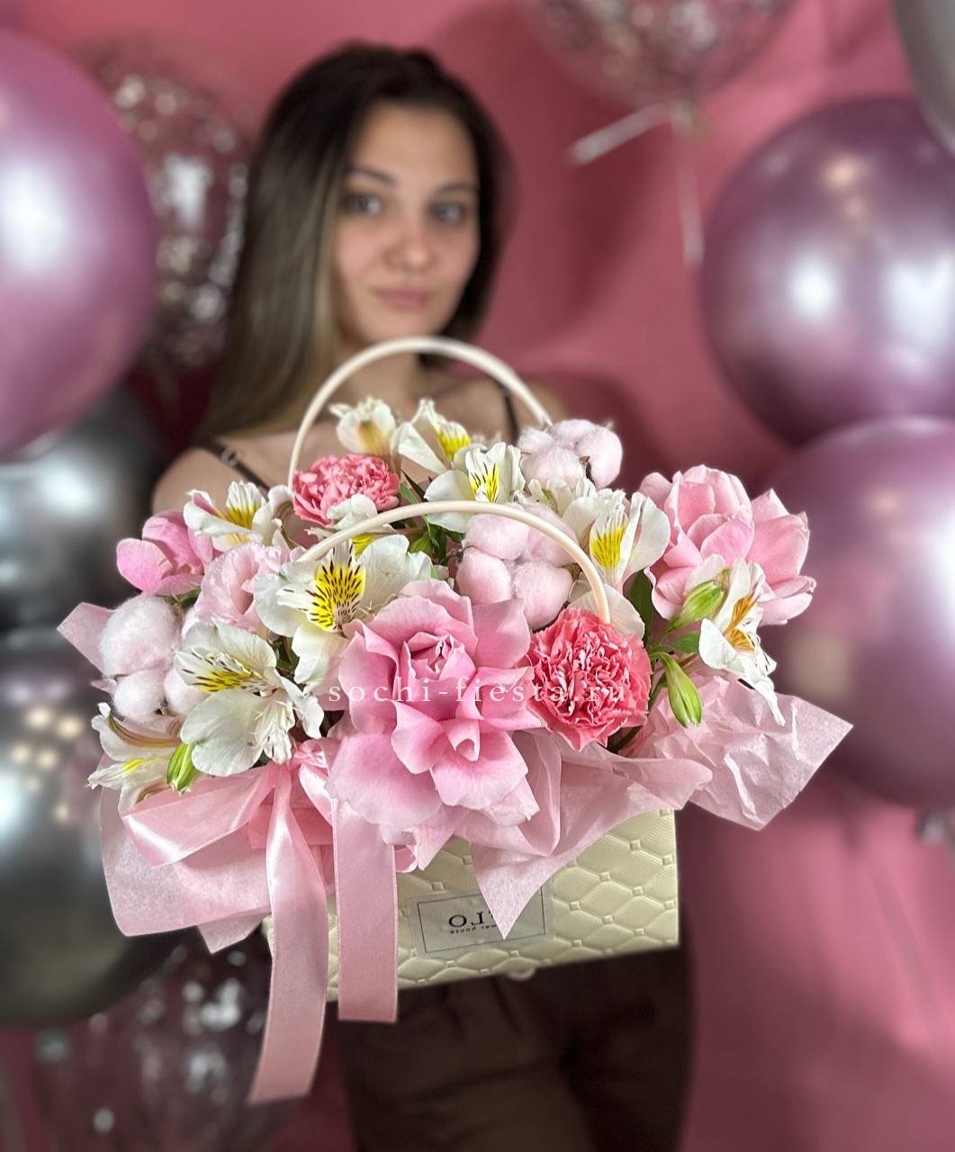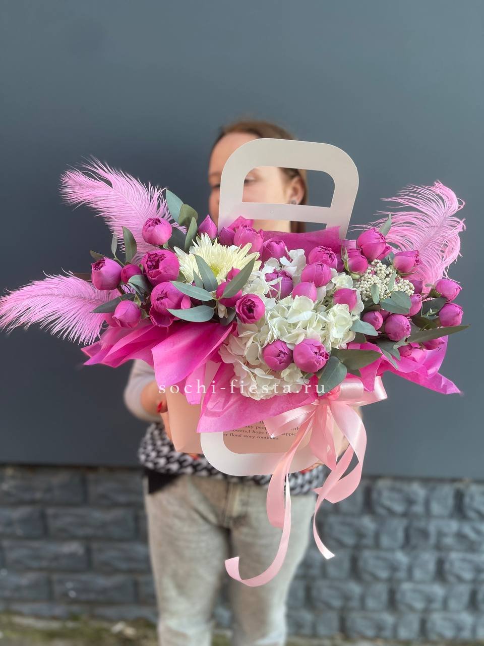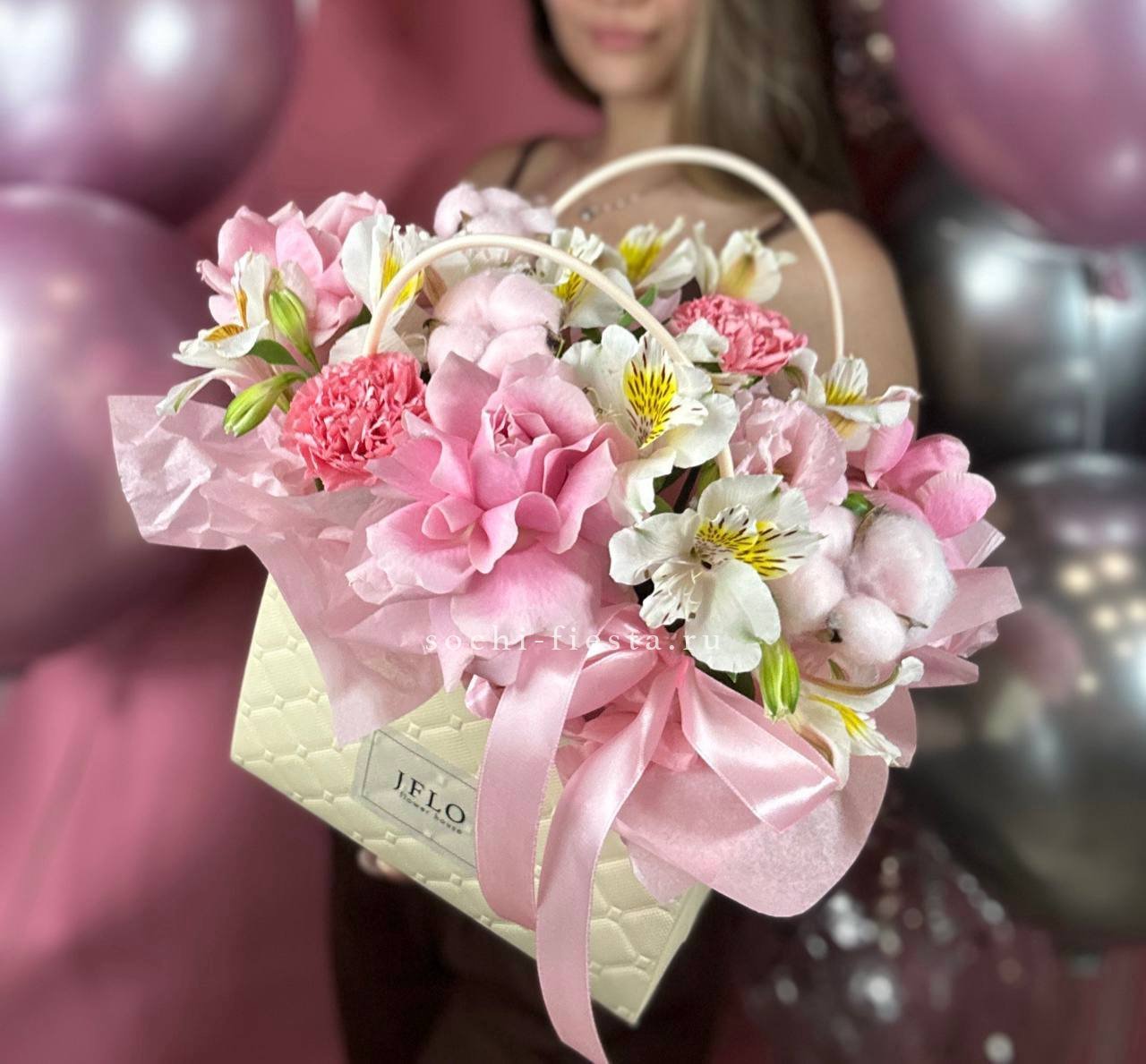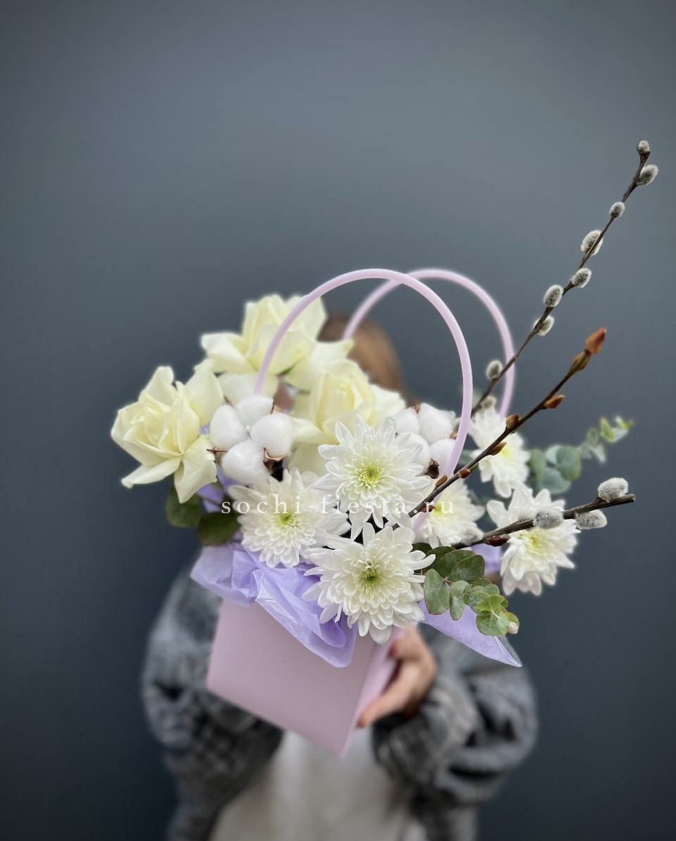 гортензия, джумилия, гербера, сумочка.