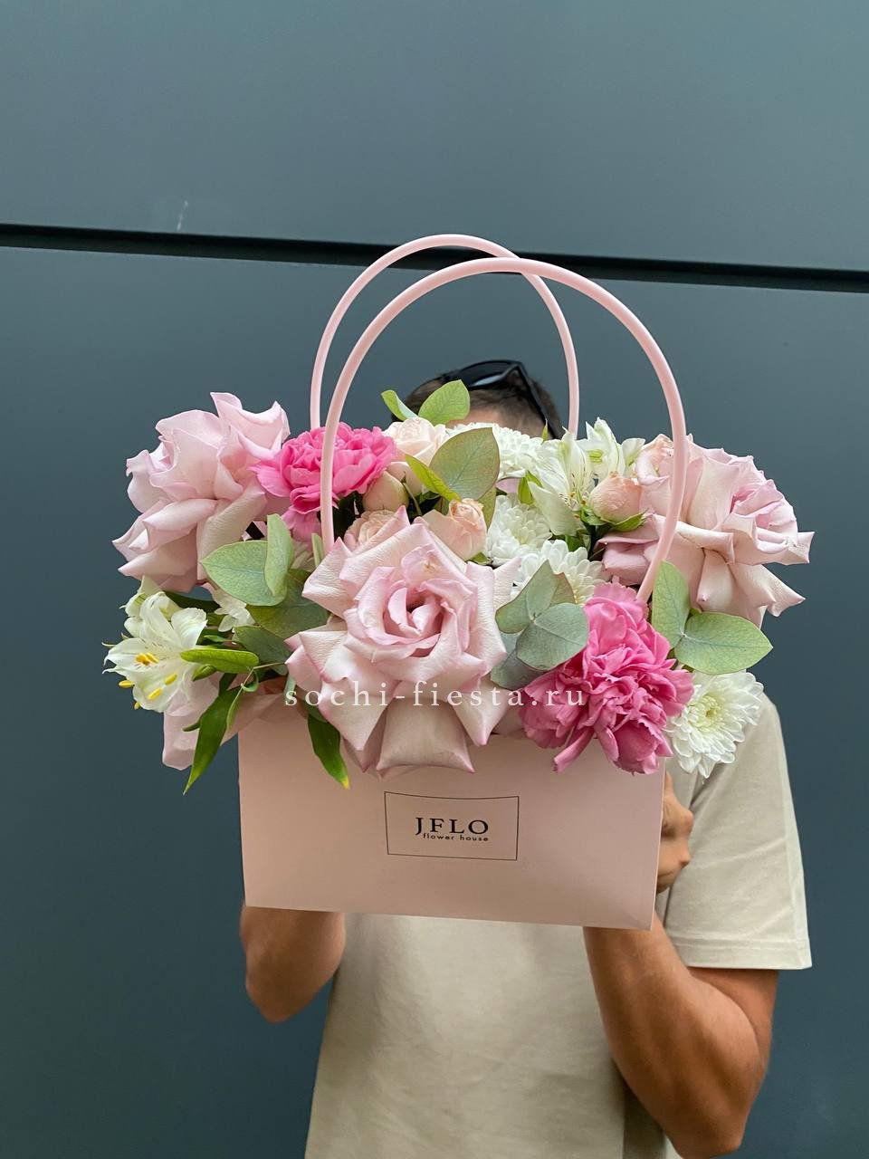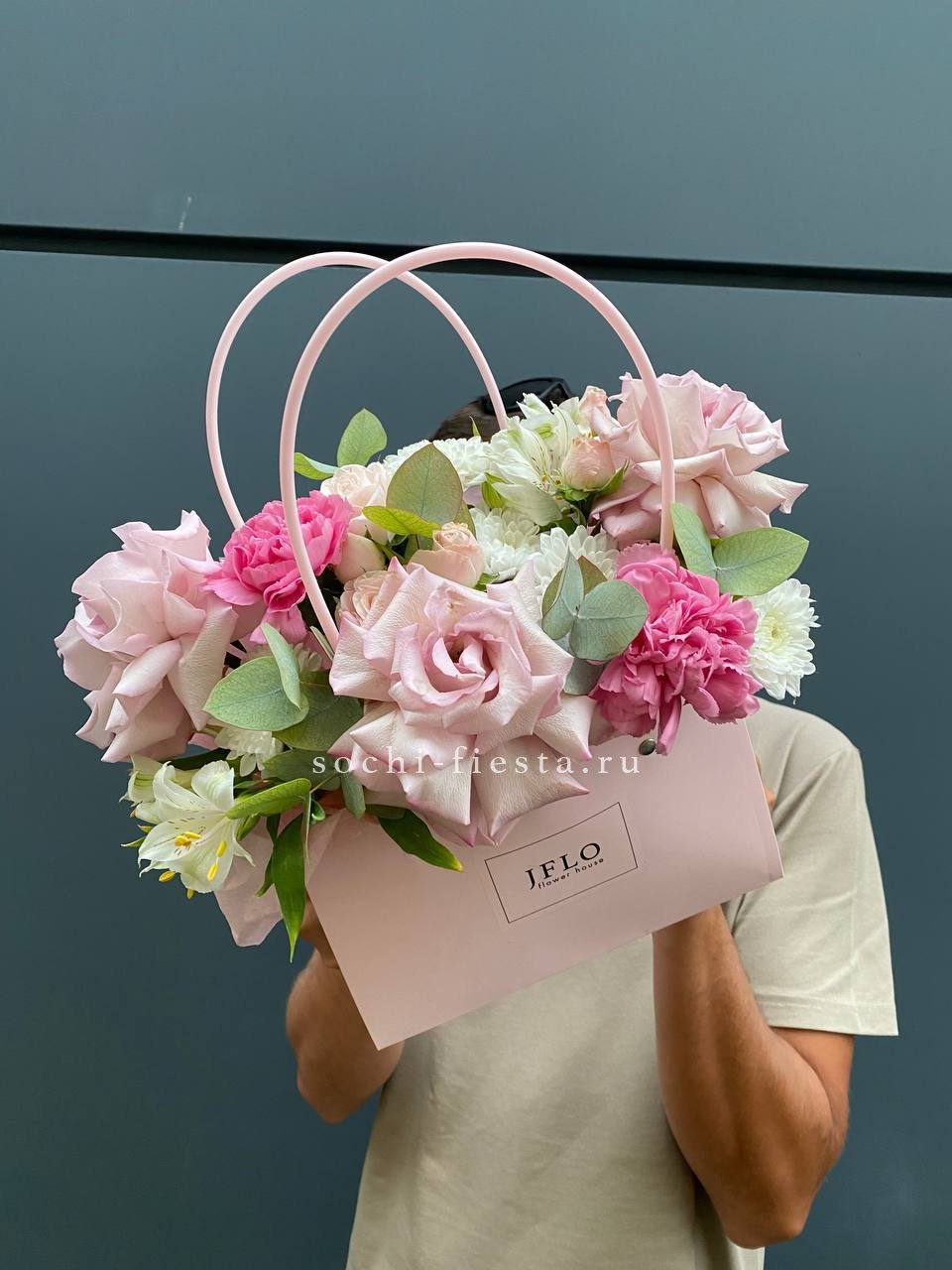 Голубая гортензия задаёт тон всей композиции, где хризантема и эустома создают объём, а хлопок с лагурусом добавляют воздушности. Сумочка вмещает насыщенную палитру без перегруженности.