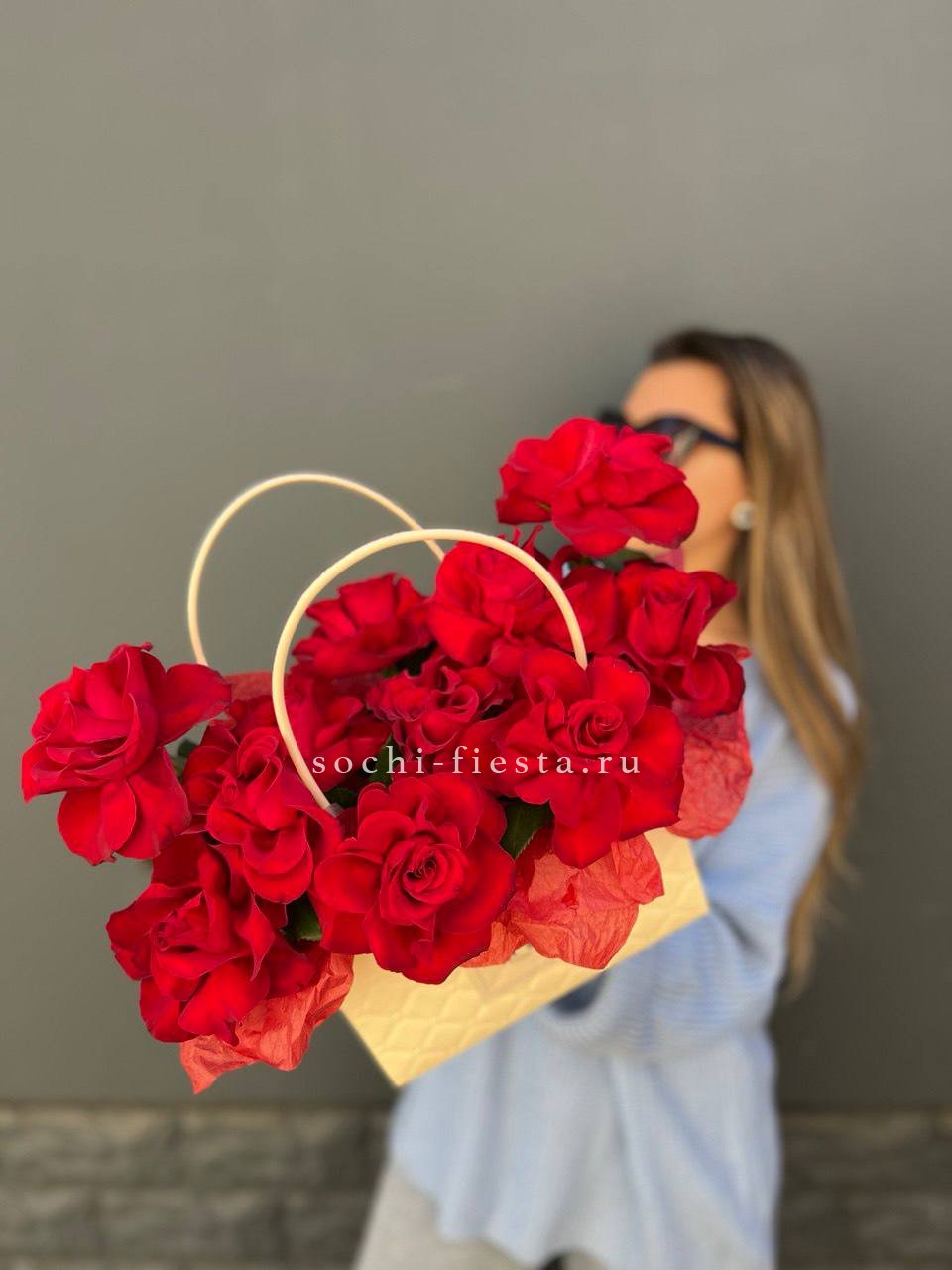 Яркая композиция в удобной сумочке объединяет розы Джумилия с герберами и воздушными соцветиями. Хлопок и лагурус добавляют природной легкости, а диантус создает цветовую динамику.