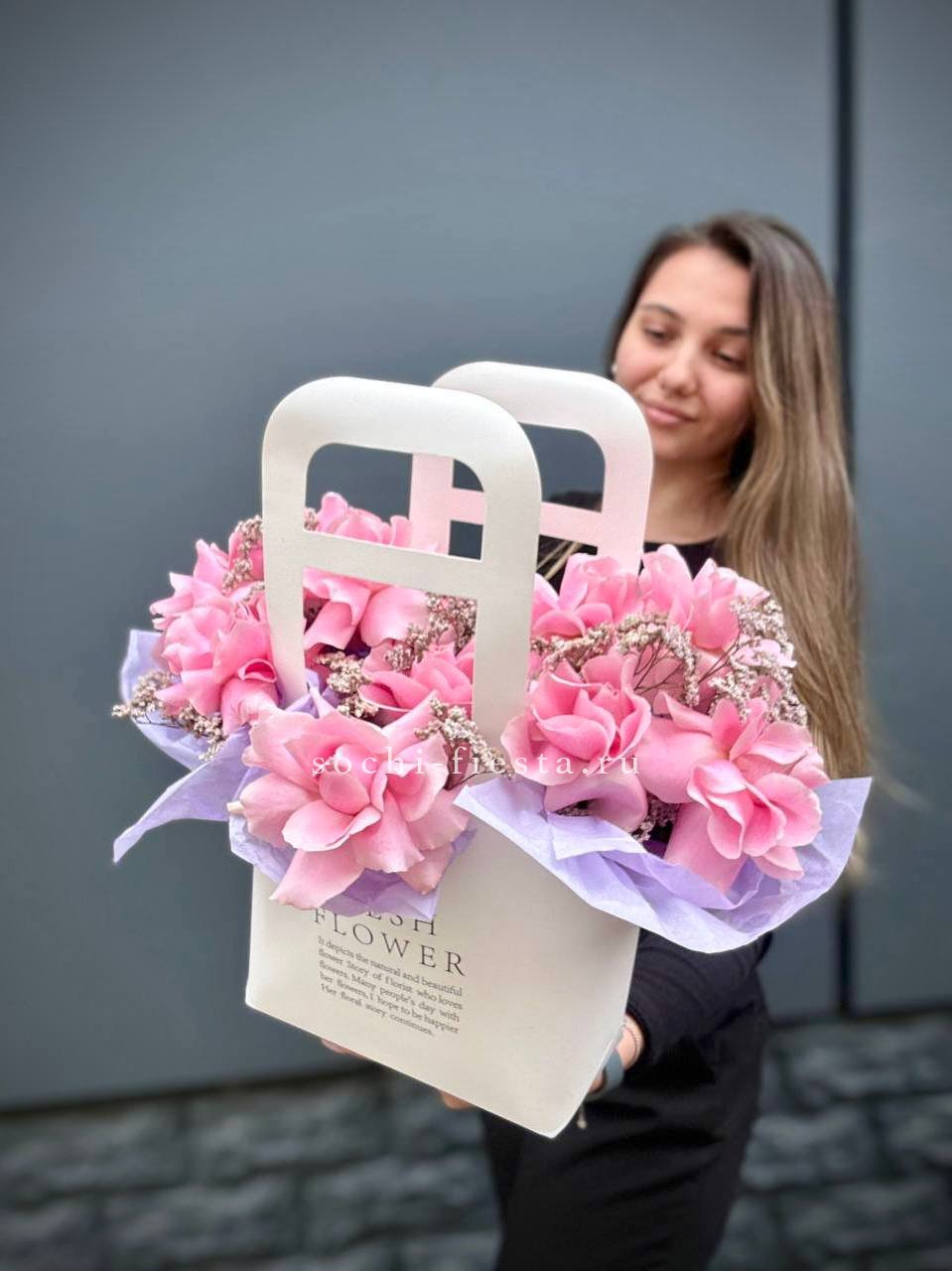 Французские розы собраны в аккуратную форму и помещены в сумочку. Компактная композиция легко помещается на столе или полке, сохраняя свежесть и опрятный вид.