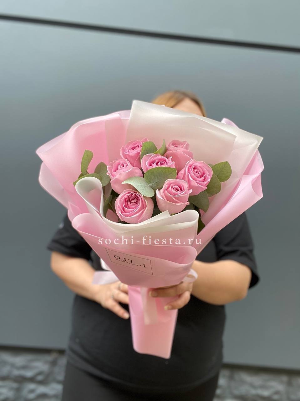 7 красных роз, эвкалипт, упаковка, лента. Данная цена доступна при единовременном заказе от 10 шт.