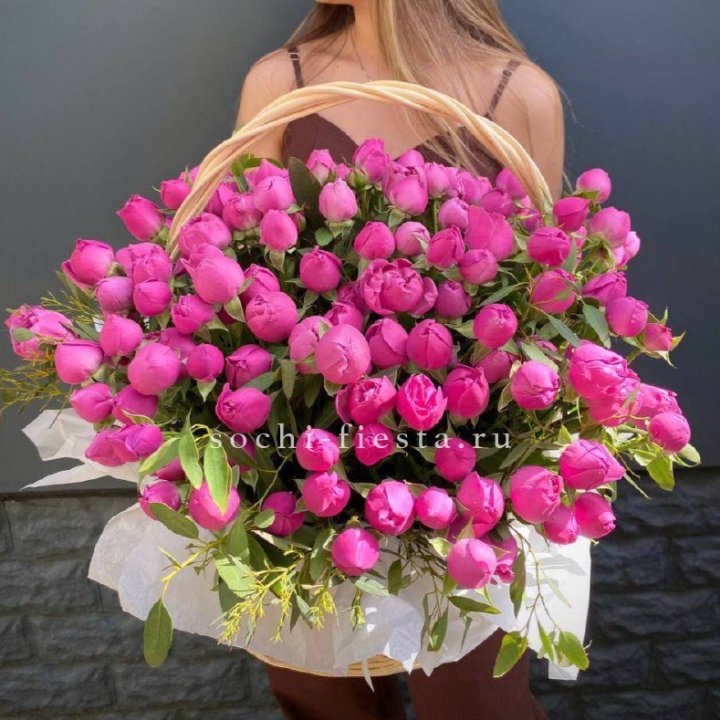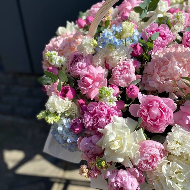 Состав корзин в Севастополи определяется текущими поставками и сезоном. Розы Freedom, Mondial, Cappuccino — для классических куполообразных аранжировок. Пионы в мае-июне из свежих поставок: Sarah Bernhardt, Red Charm, Bowl of Cream — главный сезонный продукт. Хризантема, альстромерия, гербера — для объёмных торжественных наполнений. Эустома, ранункули — для садовых корзин. Флорист строит состав под конкретный запрос.