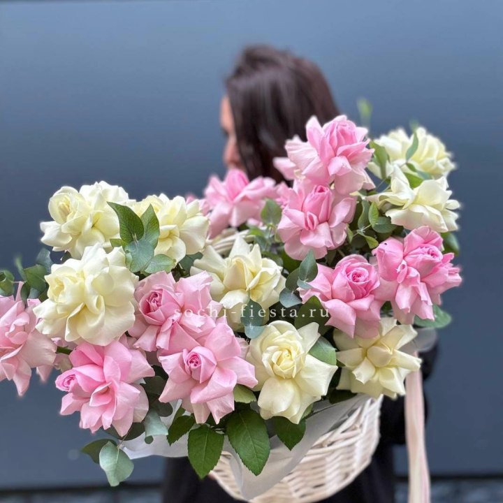 Именинная корзина в Севастополи — самый популярный частный формат. Флорист создаёт куполообразную аранжировку в плетёной корзине диаметром 35-55 см. Розы или пионы в основе, зелень и декоративные акценты — нарядный объект, который сразу создаёт торжественную атмосферу. Именно такую корзину несут на юбилей или важный день рождения, когда хотят, чтобы подарок был виден и запомнился.
