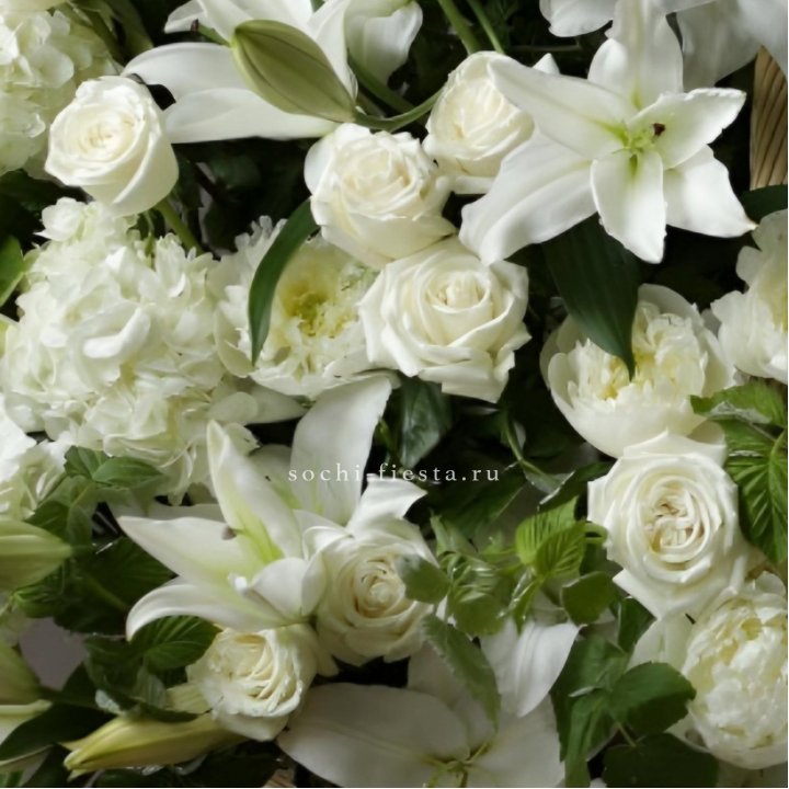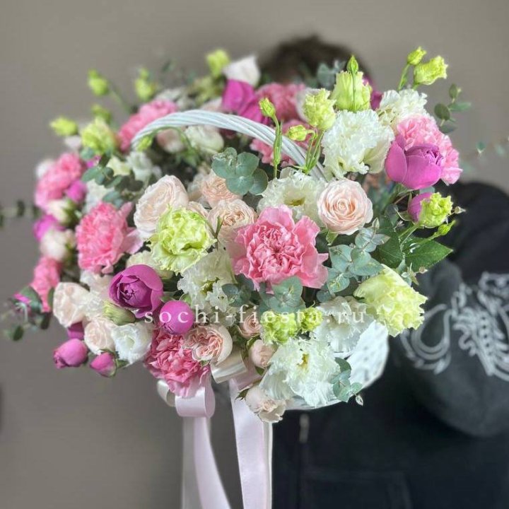 Состав корзин в Севастополи определяется текущими поставками и сезоном. Розы Freedom, Mondial, Cappuccino — для классических куполообразных аранжировок. Пионы в мае-июне из свежих поставок: Sarah Bernhardt, Red Charm, Bowl of Cream — главный сезонный продукт. Хризантема, альстромерия, гербера — для объёмных торжественных наполнений. Эустома, ранункули — для садовых корзин. Флорист строит состав под конкретный запрос.
